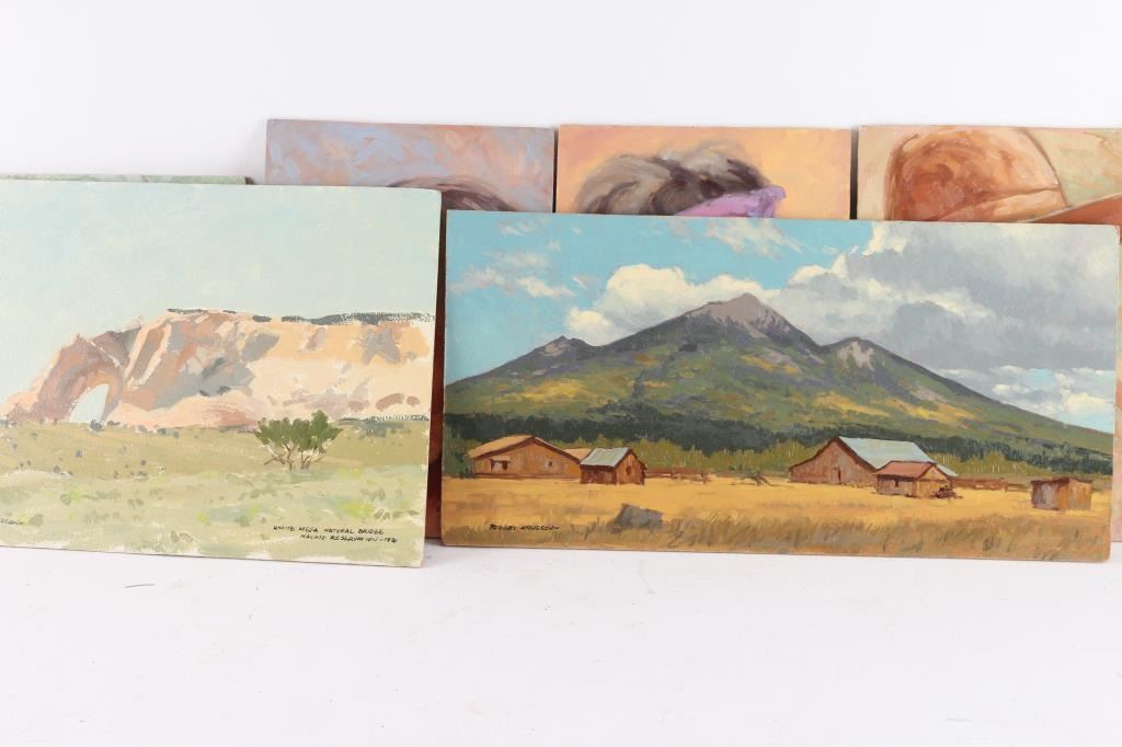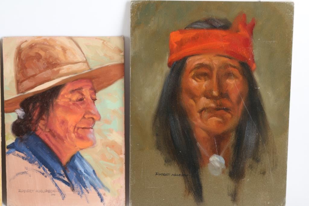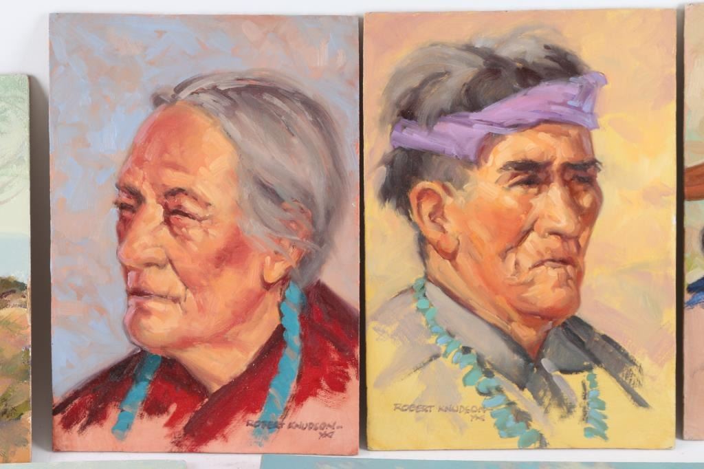 by Prescott Valley artist, Robert Knudson, all are signed. (1) "Adobe", 9x12 (2) "Portrait Study Taos Indian Man", 10x7 (3) "Portrait Study Navajo Medicine Man", 7x10 (4) "Portrait Study Navajo Man", 7"x10" (5) "White Mesa National Bridge" Navajo Reservation 1970, 9"x12" (6) "Apache Study", 9"x12" (7) Untitled, 8"x16"