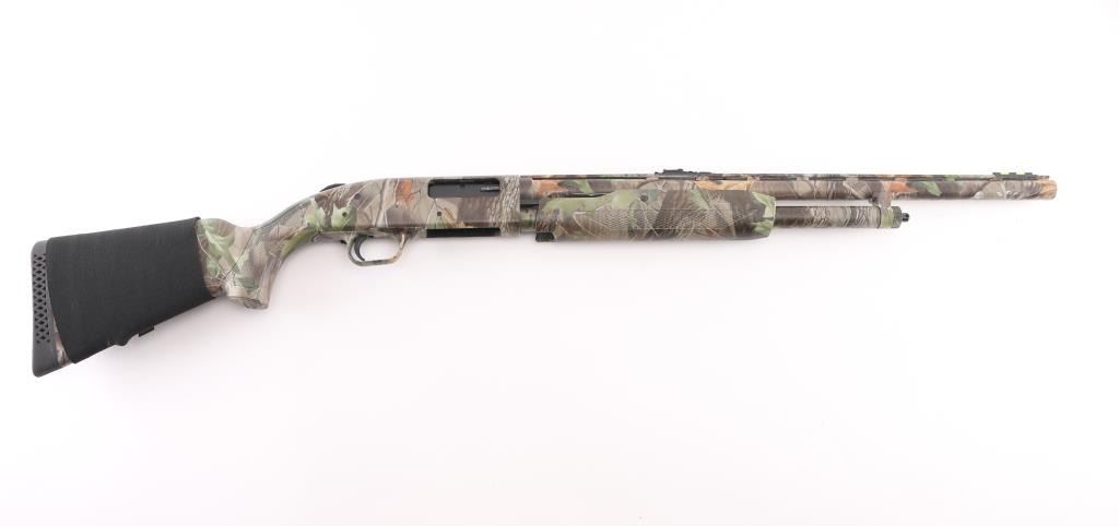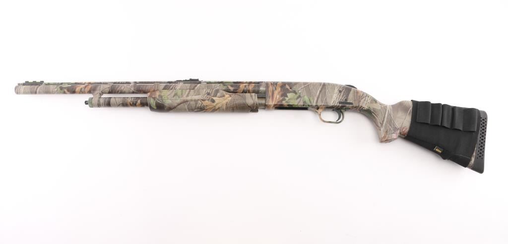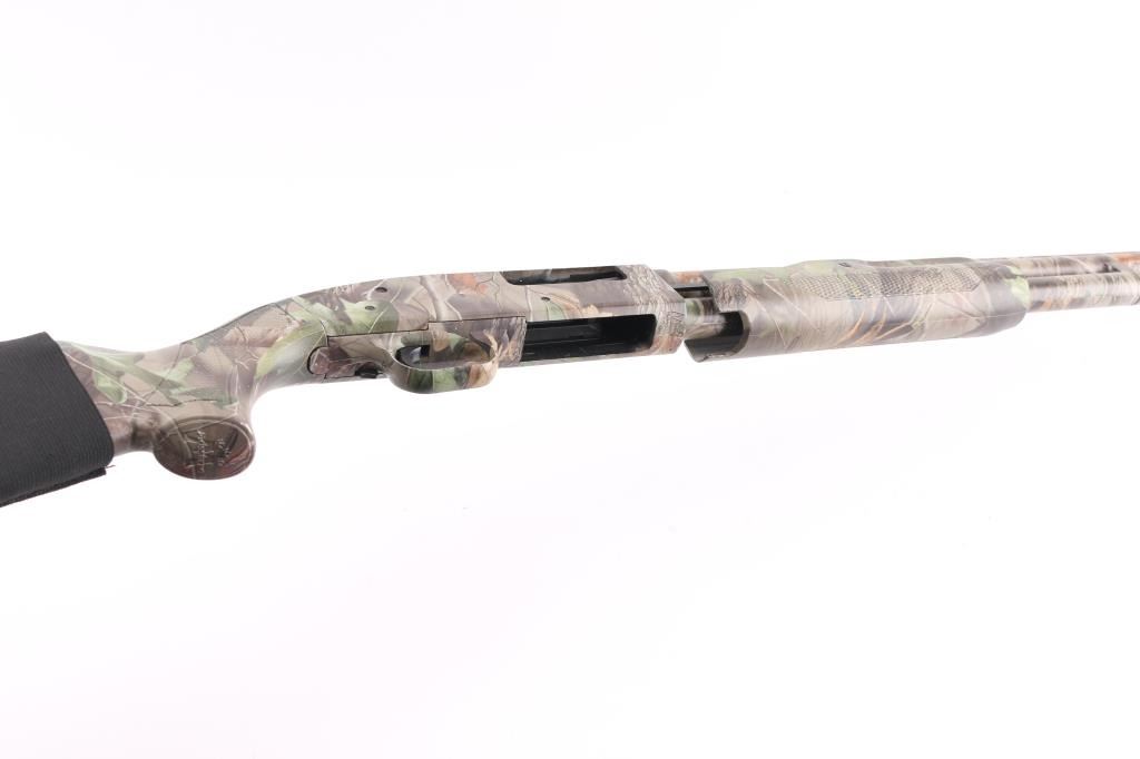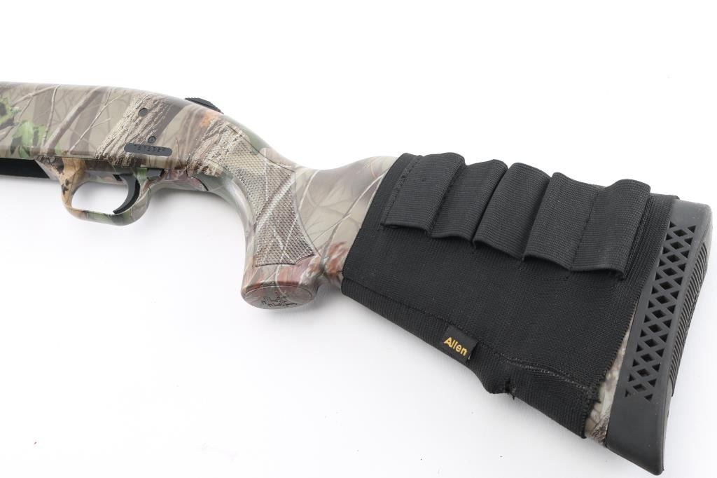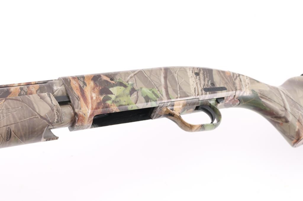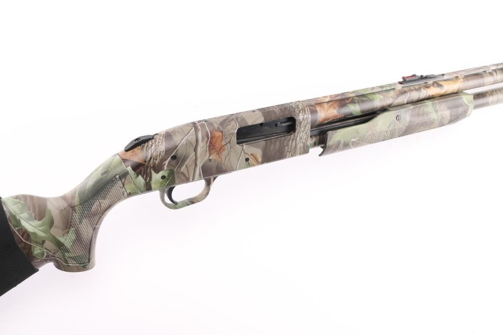 Pump action shotgun features a Mossy oak camo finish. polymer stock & pump handle with checkered panels, factory ventilated rubber recoil pad, 22" vent rib barrel with red/green fiber optic sights. installed choke measures full, 2 3/4" & 3" shells, sliding tang safety, magazine tube under barrel. Bore is excellent/bright, needs. Camo finish is excellent, action is smooth. Polymer furniture is excellent condition. Like new. Nylon shell holder on butt stock. Great Turkey gun. NRA Condition-Excellent. Modern firearm.