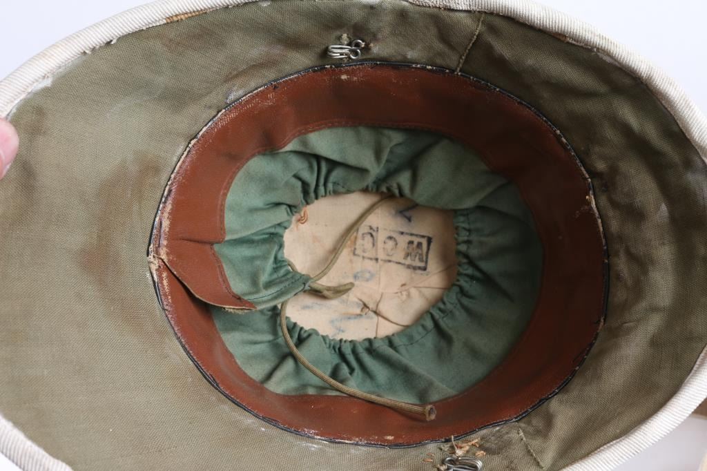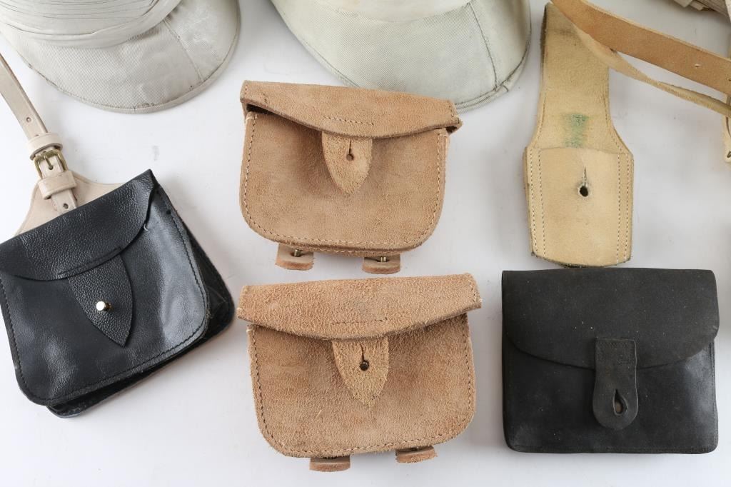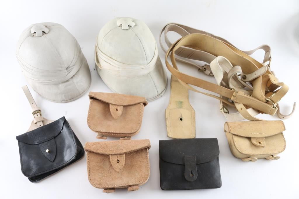 Consists of 2 Pattern 1902 Pith Helmets, one marked W.C.C. (Western Costume Co.), 2 sets of pattern 1871 white leather shoulder cross straps, black leather cartridge box, black leather accouterments pouch, bayonet frog, and 3 cartridge boxes.
