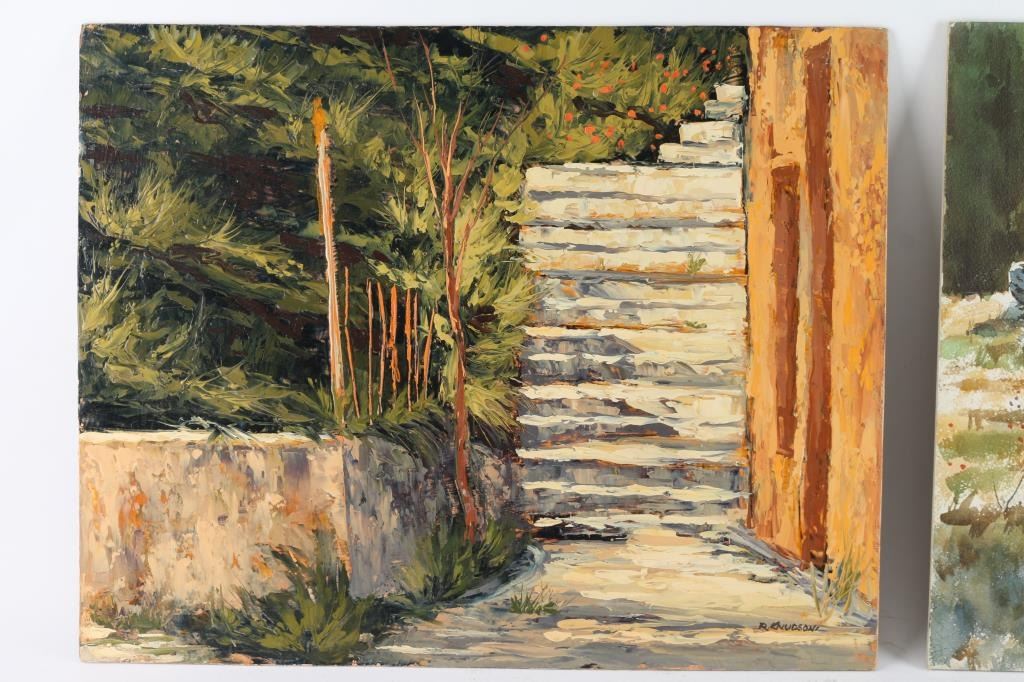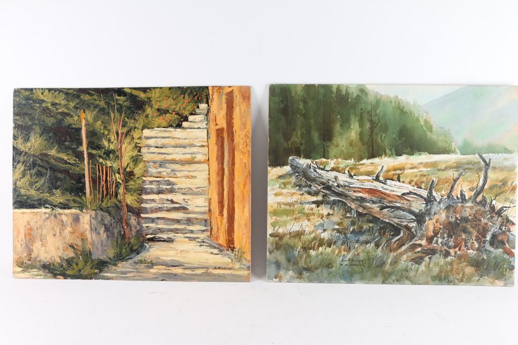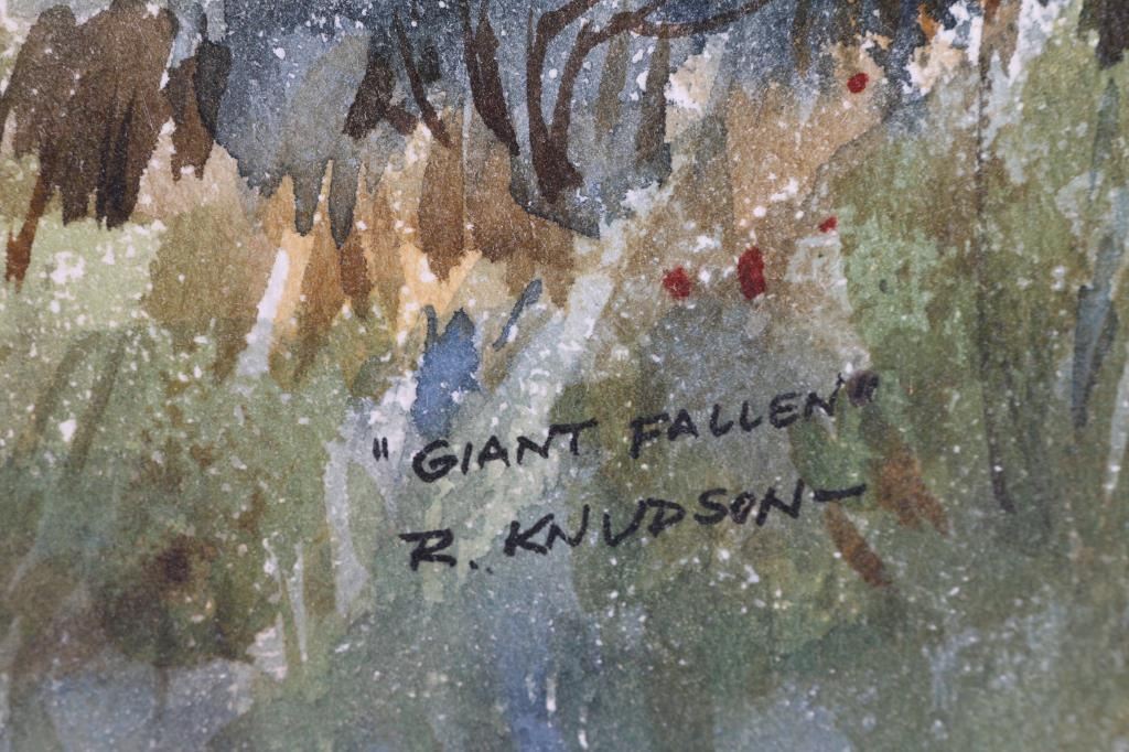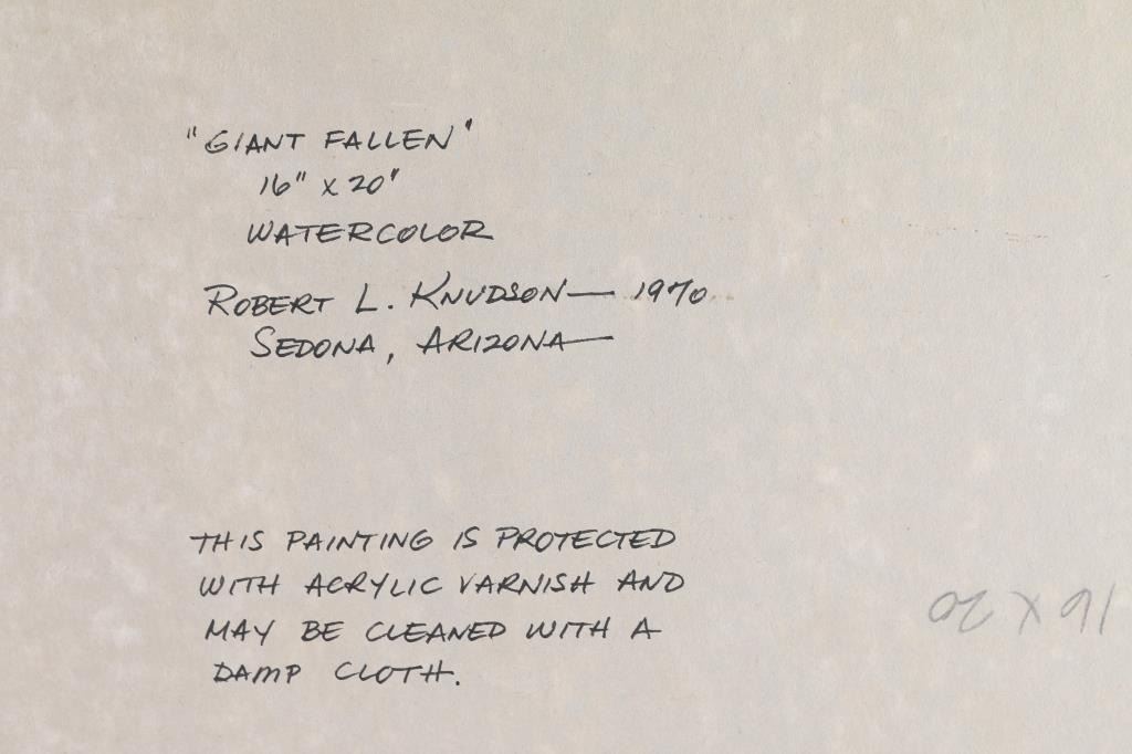 by Prescott Valley artist, Robert Knudson showing Arizona landscapes. First is a watercolor titled, "Giant Fallen, 1970, Sedona" and measures 16"x20". Second is an oil, marked "Mid-1960's Jerome" on the back, and measures 16"x20". Both signed. The work of Bob Knudson is represented in major collections through out the US including the William Penn Memorial Museum amd the Museum of Northern AZ. His painting frequently appear in Arizona Highways and he has been member of the Mountain Oyster Club the oldest and most prestigious cattleman's club in the Southwest.