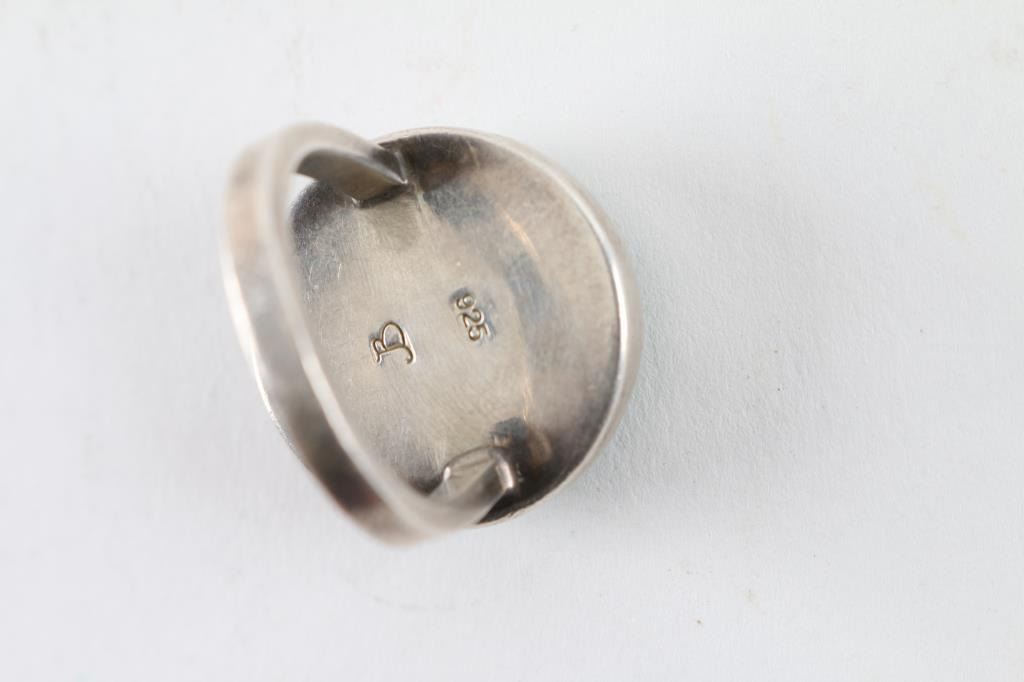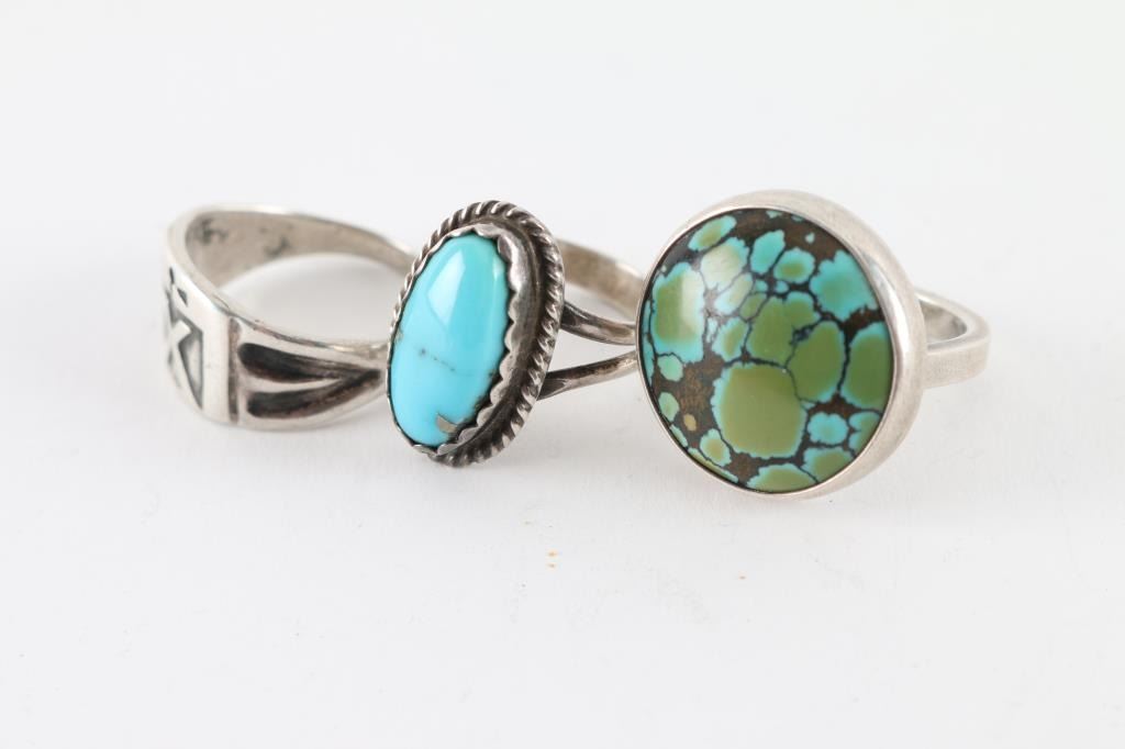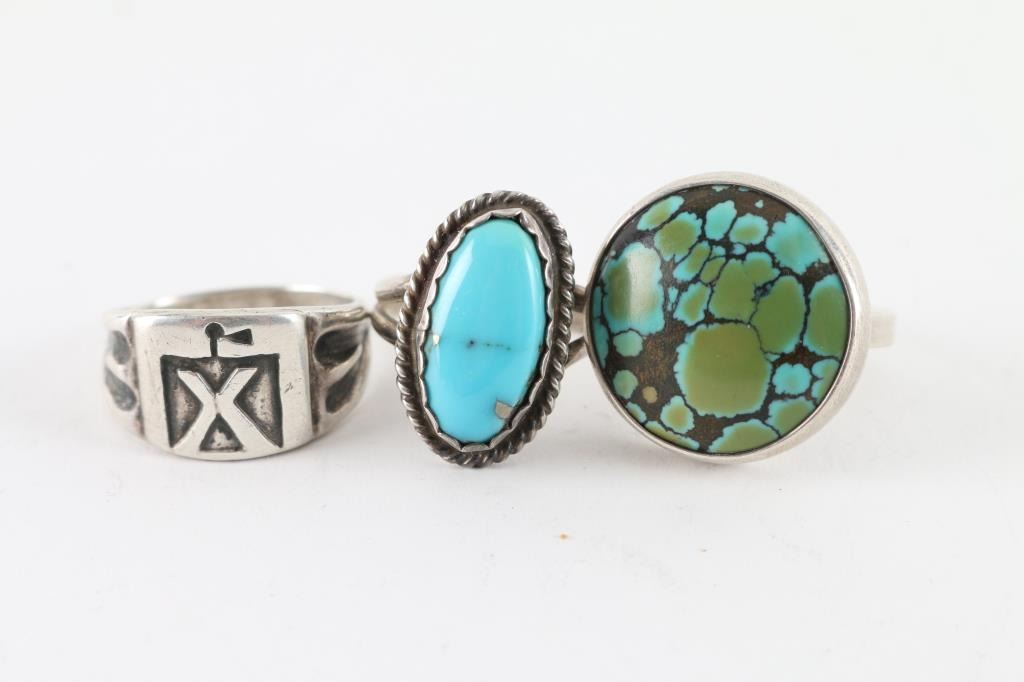 (1) Large Turquoise ring set in sterling (1) Single Stone Navajo ring set in sterling (1) All sterling ring with "X"