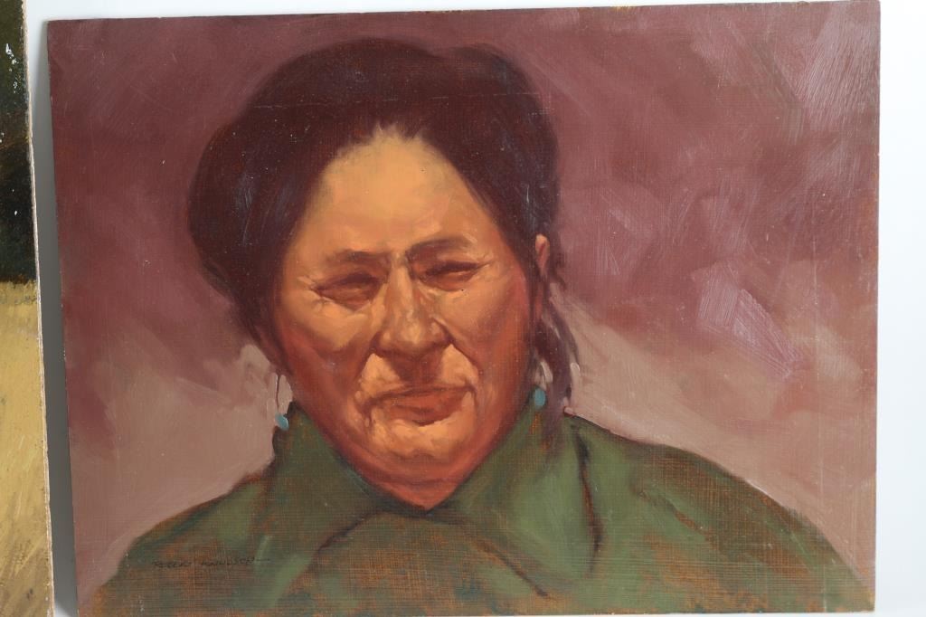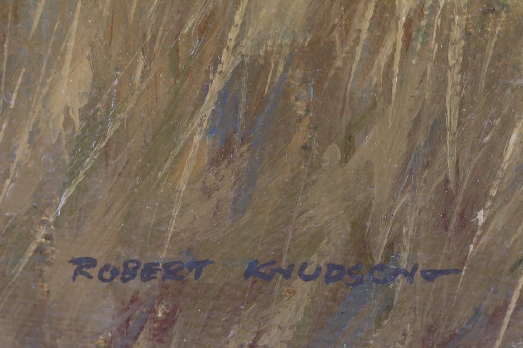 by Prescott Valley artist, Robert Knudson. First is not titled, and shows a broken fence in a meadow of flowers. It is marked "Circa 1963/64" and measures 12"x16". The second showns an Indian, titled, "Ason Begay" marked "1974 'Heritage of the Navajo' Series" The third is dated "1974, Williams, Arizona" measures 14"x18". All are signed. The work of Bob Knudson is represented in major collections through out the US including the William Penn Memorial Museum amd the Museum of Northern AZ. His painting frequently appear in Arizona Highways and he has been member of the Mountain Oyster Club the oldest and most prestigious cattleman's club in the Southwest.