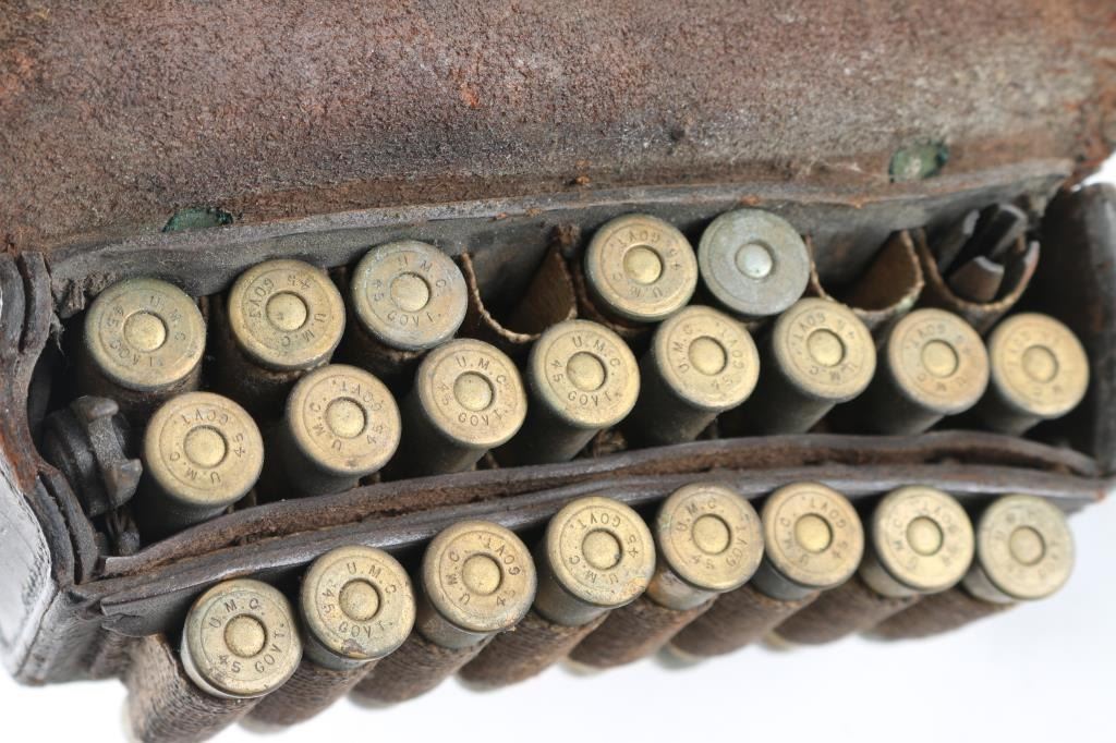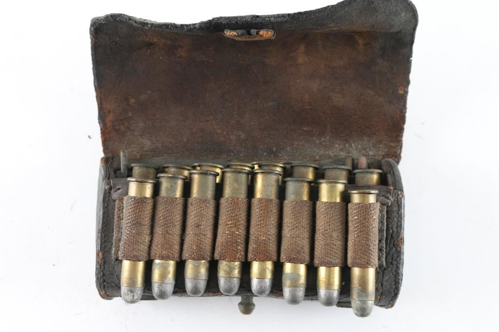 Early Indian Wars, "Custer era" Hagner No.2 Cartridge Pouch – Modified for Cavalry Use. This variant had the brass finial and closing tab interchanged for easier access to ammunition for the cavalryman. The pouch holds 24 rounds of .45/70 ammunition. Also fitted with a swelled section for the combination tool. This variation has 18 canvas loops on the inside, and 8 loops sewn on the outside of the front, there is a faint outline of the US oval visible. Contains 21 vintage rounds of 45-70 cartridges made by U.M.C, a period broken shell extractor, and combination tool. the pouch is poor with stiff, flaking leather, and the flap strap is broken.