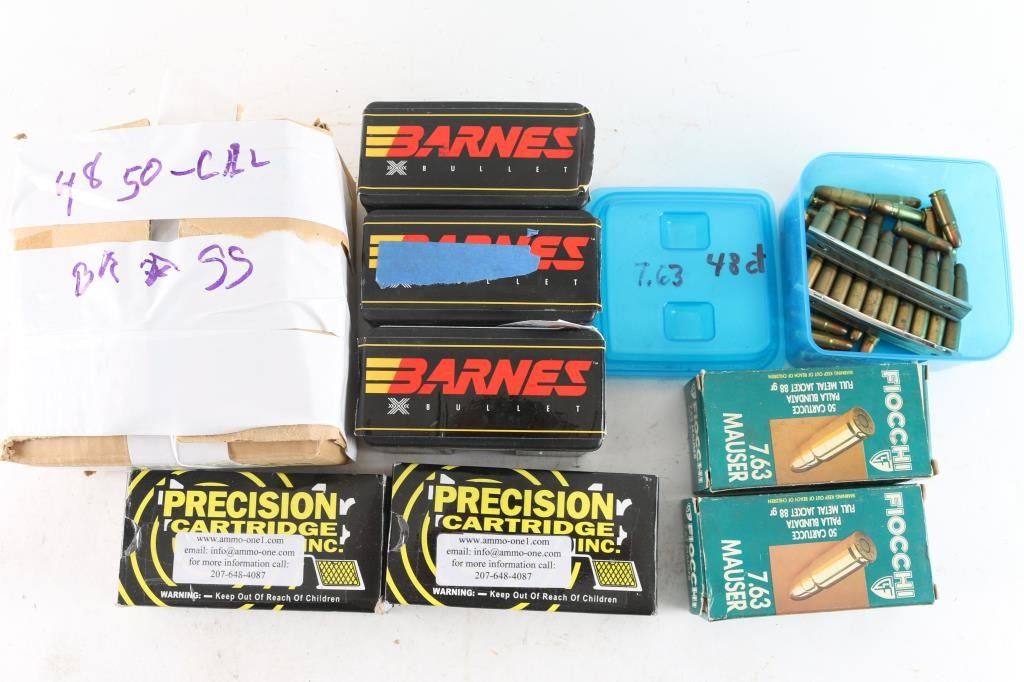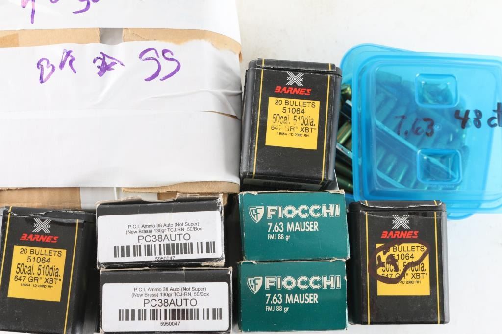 Includes (48) Browning .50 Cal empty shell casings & (54) Barnes .50 Cal 647 Gr. XBT bullets. 148 rounds of 7.63 Mauser ammunition, in Fiocchi factory boxes and loose in plastic container. 100 rounds of Precision Cartridge 38 Auto, in factory boxes.