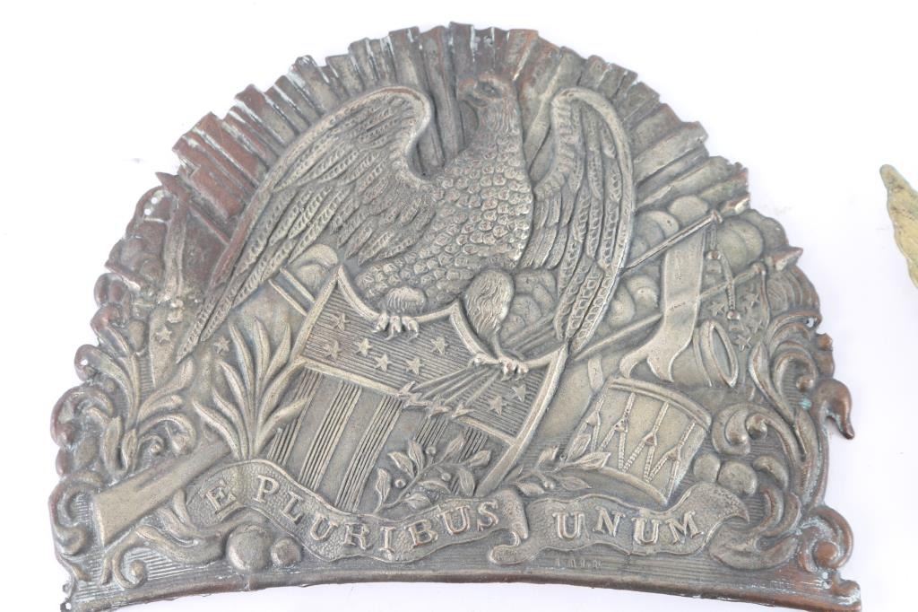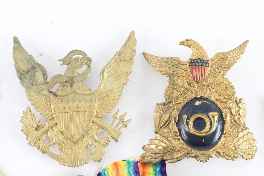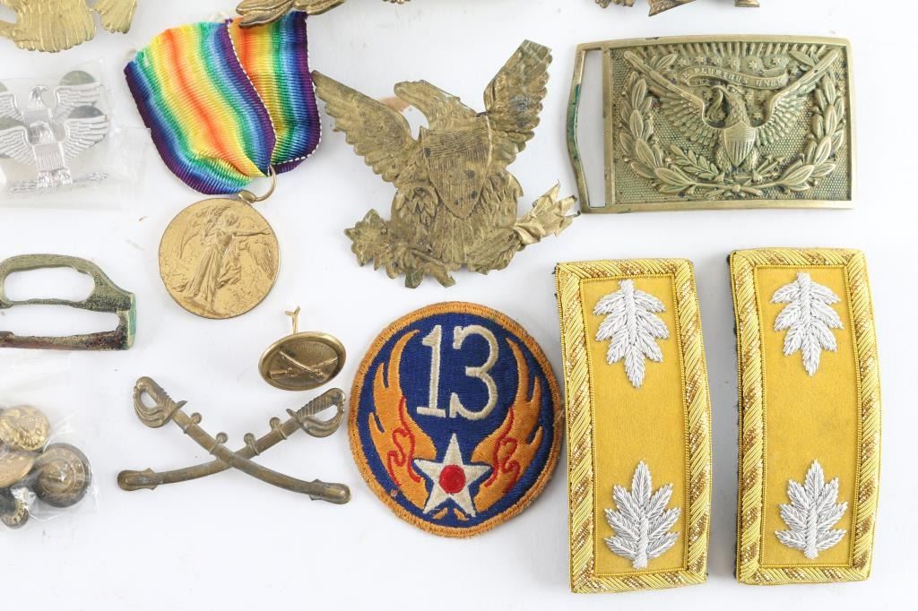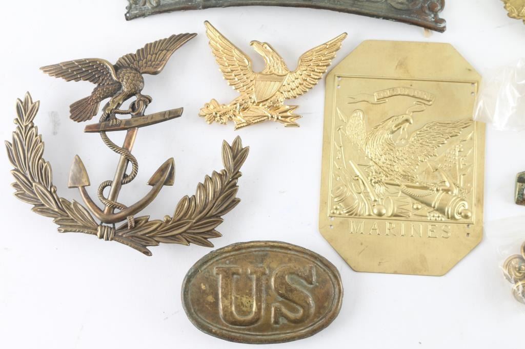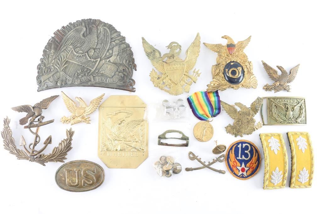 1) There was a drill competition held in the Army of the Potomac. The winning regiments were to receive fancy French Chassuer uniforms. The winners of the competition were the 62nd, 83rd Pennsylvania & the 18th Massachusetts. Part of the uniform they received was a leather shako with stamped brass front plate. This is a plate from one of those shakos. At center is an infantry hunting horn insignia on a black painted field. The black paint shows several small chips. A large wreath of oak leaves surrounds this central design, which is surmounted by a spread-winged eagle with a painted US shield on his chest. The paint on the shield is in good condition. Reverse has two brass wires for attaching. 2) 1834 Light Infantry "Eagle" Cap Plate for 1832 US Army Shako. Stamped brass. prongs intact. 3) Early Infantry Eagle plate for use with the M1821 shako, very thin stamped brass, prongs intact, the left wing tip has been folded. 4) U.S. Civil War regulation 1851 pattern, brass, eagle waist belt plate is the rectangular, concave, detailed plate. Comes with Keeper. 5} Brass U.S. Civil War belt buckle, lead filled back with belt loop and prong. Nice patina. 6) WW2 USAAF 13th Air force patch 7) WW1 Victory medal, restrike. 7) Civil War/Indian Wars crossed sabers for kepi, prongs have broken off. 8) Six Indian Wars Eagle buttons. 9) Army Majors dress Cavalry shoulder straps, New. 9) M1881 helmet plate Helmet plate displays the Great Seal of the United States, with the American Eagle with a banner in it's beak stating: E PLURIBUS UNUM. Helmet plate is in excellent condition, with all three attachment hooks present. The side cockades over the years are of crossed Rifles for an Infantry Soldier, with brass crossed rifles M1881 side button. 10) Mexican American War Shako Helmet Plate. 7" x 51/2", maker marked "Bale". 11) Lot of 3 reproduction shako plates. M1834 light infantry eagle, M1820 USMC eagle/anchor plate, and War of 1812 era "Marines" brass shako plate. 12) Pair of silver toned Colonel rank insignia.