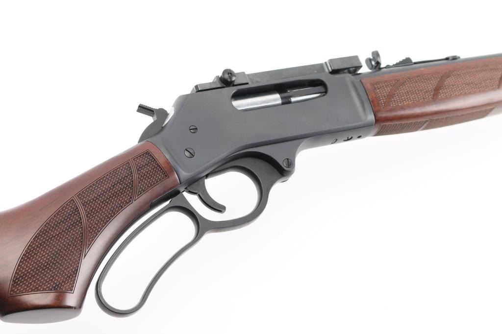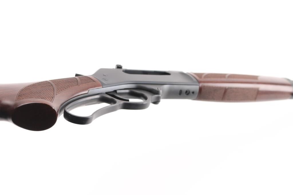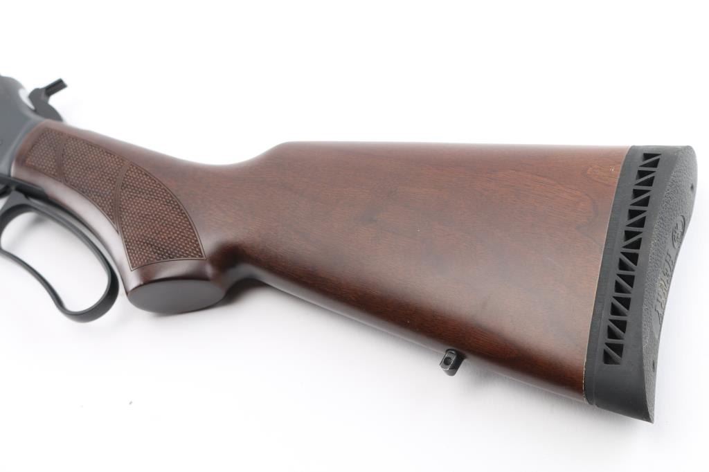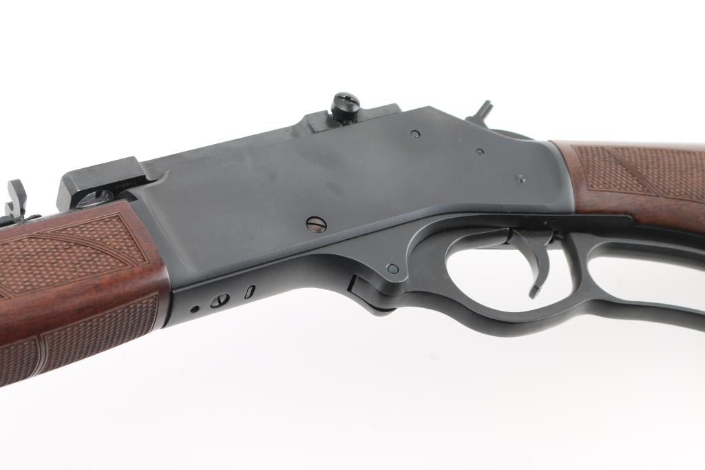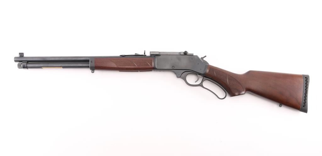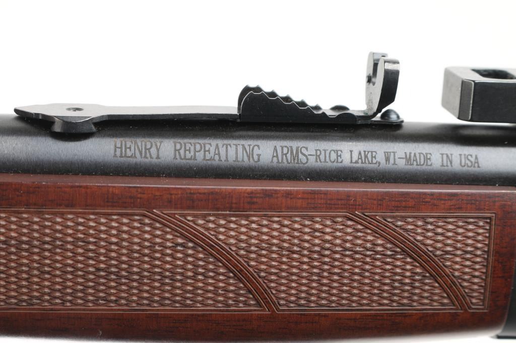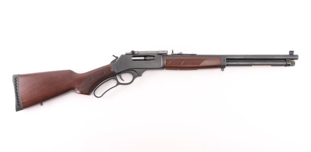 Optics ready large bore lever-action rifle. "Big Boy Steel" American made by Henry. Barrel address is Rice Lake WI. 18.43" round barrel with post/brass bead front, and adjustable semi-buckhorn rear sights. Scope rail attached to receiver. Checkered walnut stock/forearm. Black rubber vented buttplate. Full length magazine. (4 rds) Blue finish with matte-black receiver. Smooth trigger. Sling swivel studs. Bore is excellent/bright. Action is smooth/tight. Metal/wood are excellent. Rifle appears in almost new condition. NRA Condition-Excellent. Modern Firearm.