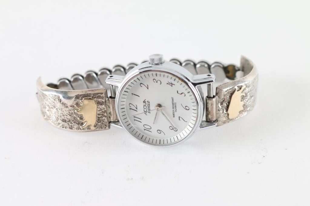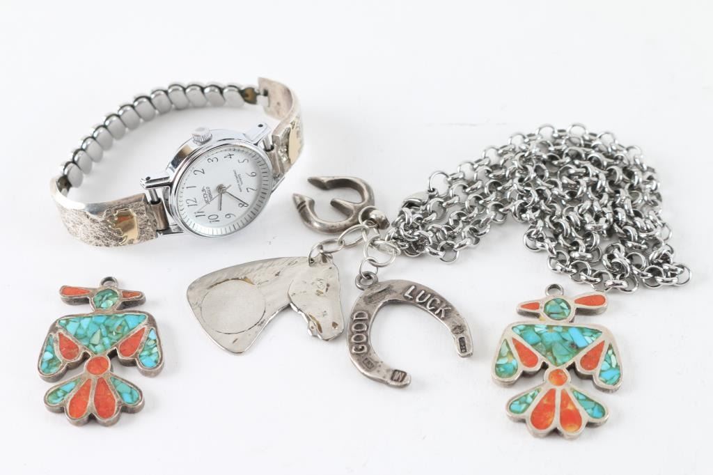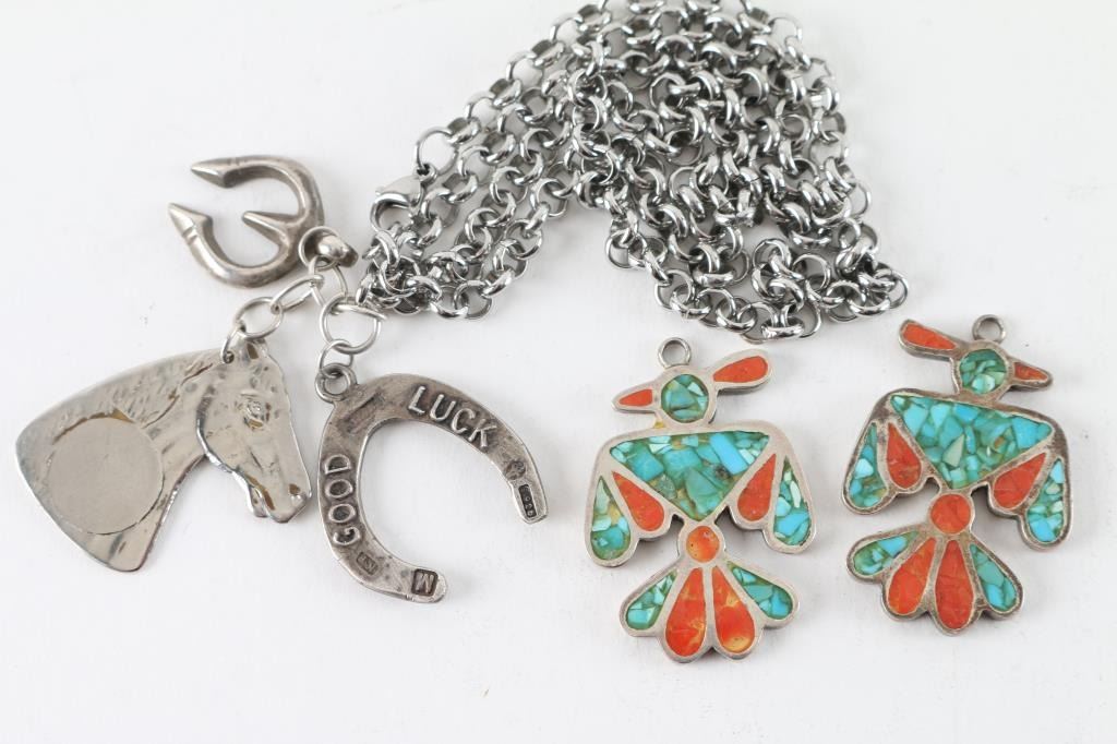 (1) Pair of thunderbird pendants (1) Sterling & Gold Watch band with buffalo motif (1) Necklace with Sterling Naja, Good luck horseshoe, and silver colored horse pendant on silver colored chain not sterling.