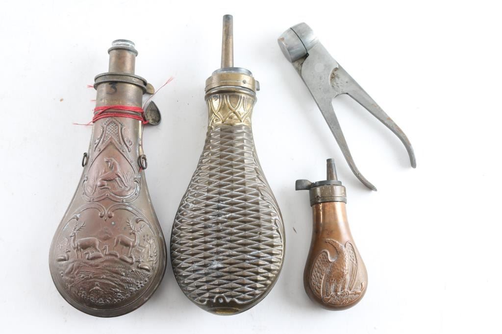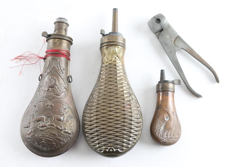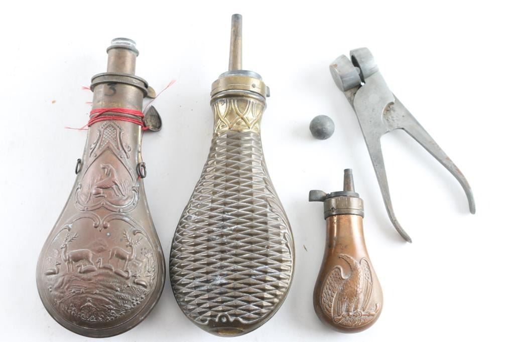 Includes two late 19th or early 20th century brass powder flasks. One has original spout showing good sign of age w/pineapple pattern, other is missing spout but has raised pictorial of hound & deer, with some light patina on one side. Third is a smaller copper flask with Eagle & pistol pictorial. Includes a bullet mold. All in fair condition.