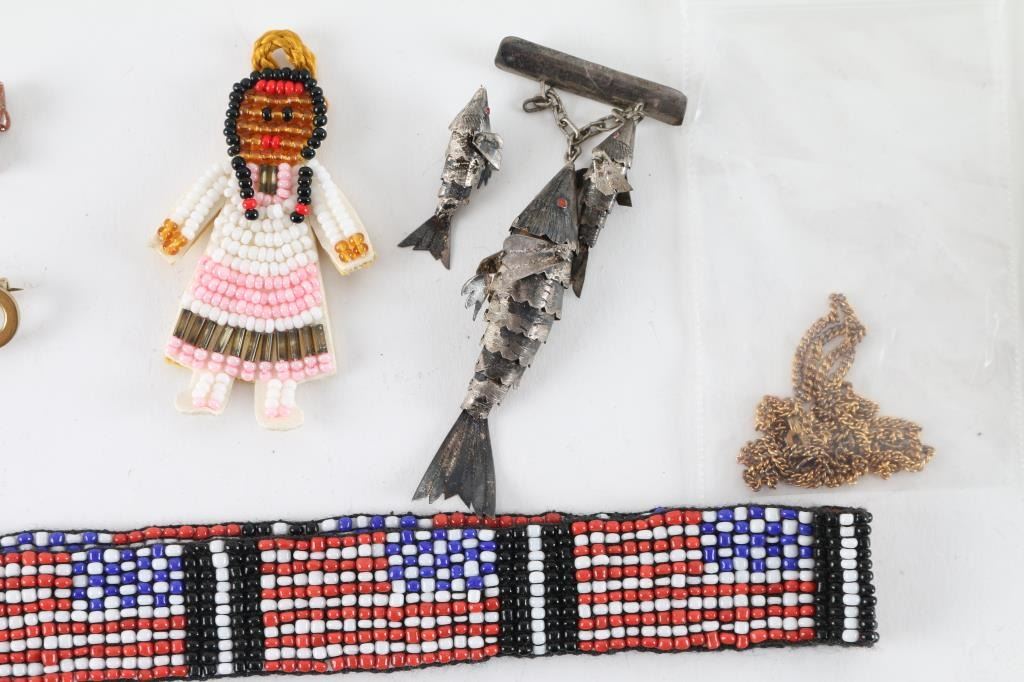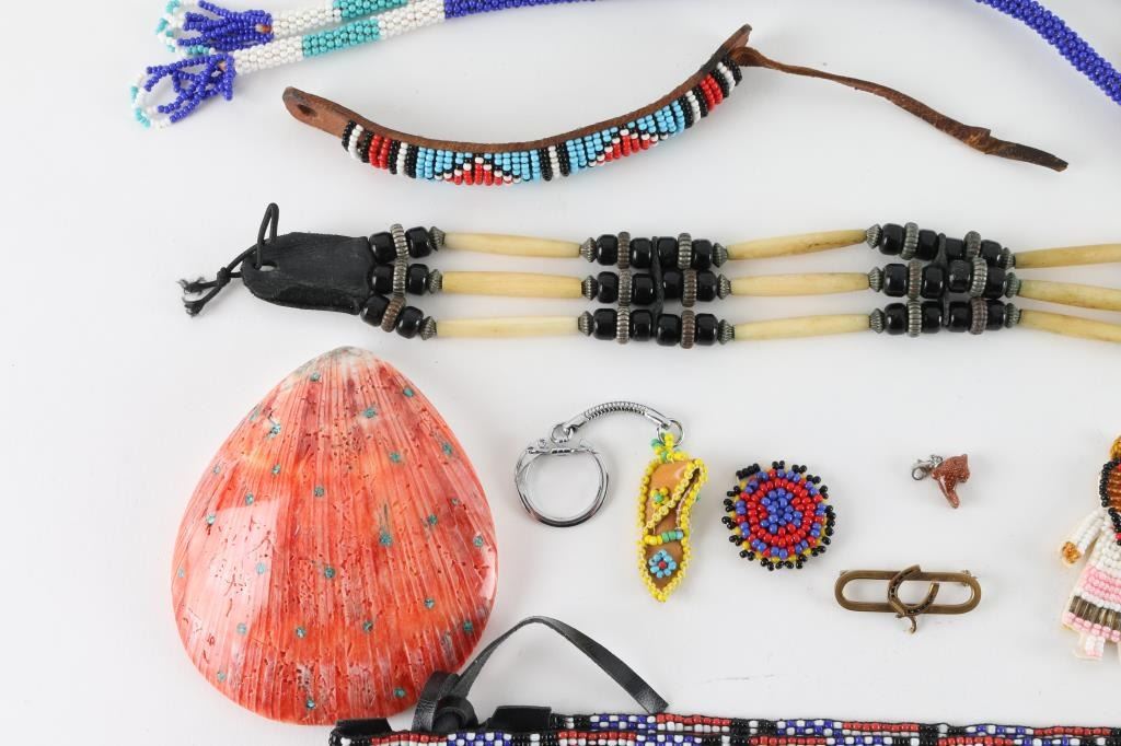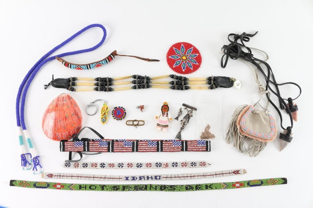 includes Bone choker, beaded strips, horseshoe pin, arrowhead pendant , shell, fish pin and more.
