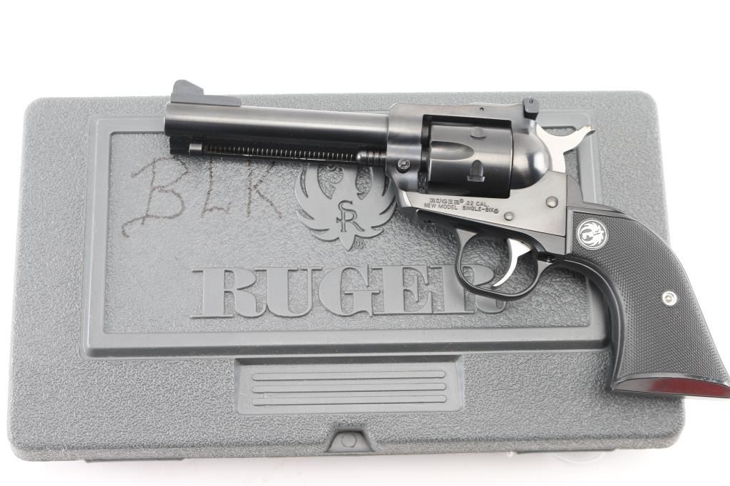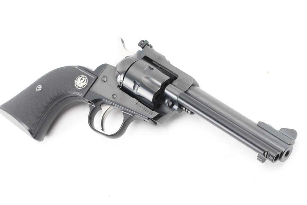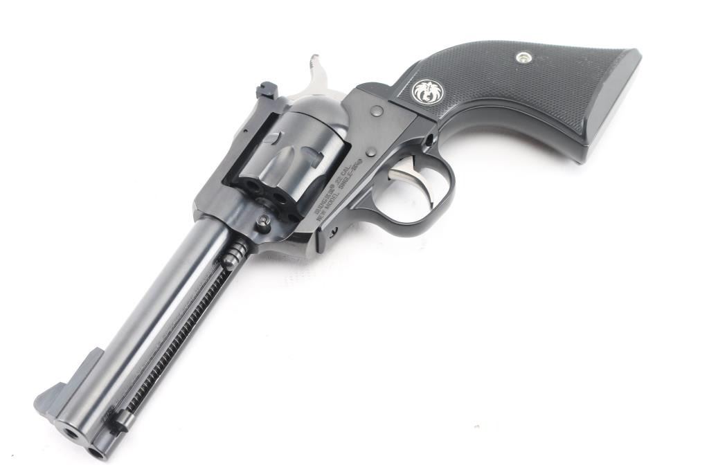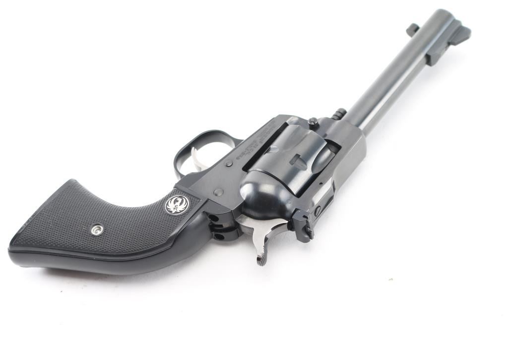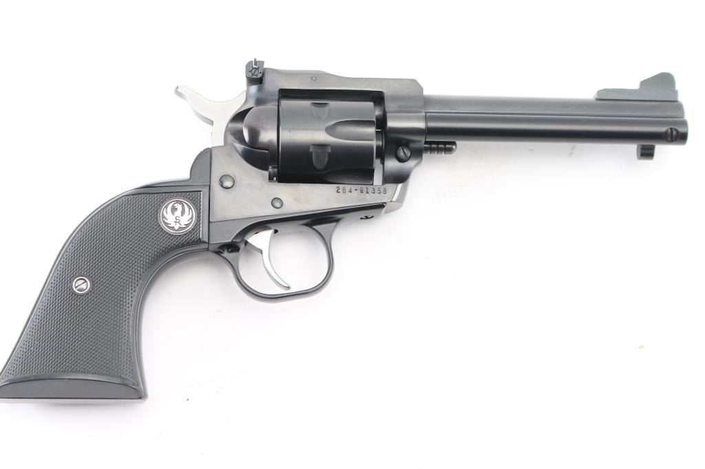 SN: 264-91358. Single action rimfire revolver manufactured 2007, with 22 Long Rifle cylinder installed, convertible to 22 Magnum with the included additional cylinder. 'Three Screw' old model. Features blued finish, black checkered grips with Ruger medallions, 4.5" barrel, Partridge front & adjustable rear sights, fluted 6 shot cylinder (Magnum cylinder also fluted). Bore is excellent. Retains 99% blue, grips are excellent. Action is smooth with tight lock-up. Comes in it's gray plastic factory box with manual/paperwork. Condition is NRA Excellent. Modern Firearm.