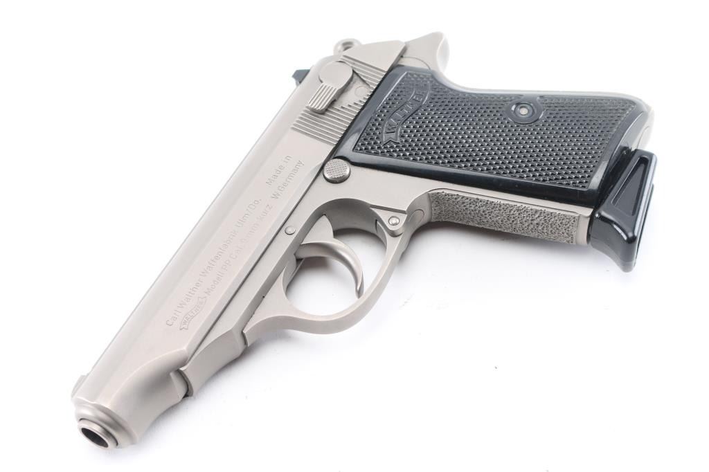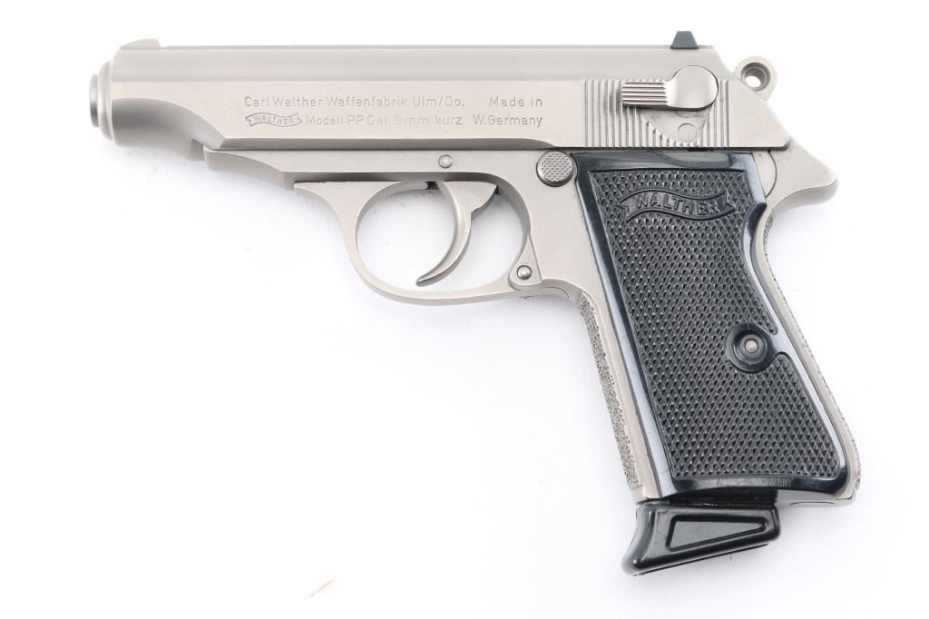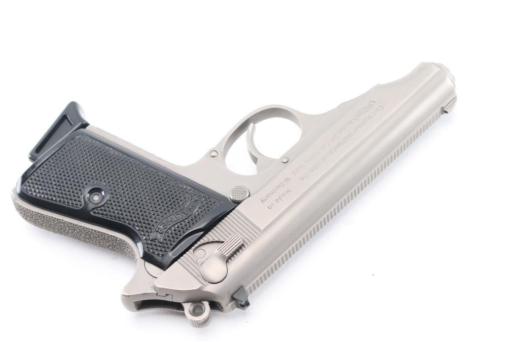This Pistol NP3 coating by Robar Inc, which makes it extremely resistant to wear. German double action semi-automatic compact pistol, imported by Interarms of Alexandria, VA. Features all steel construction, brushed stainless finish, 3.8" barrel, fixed sights (rear in dovetail), serrated round hammer spur, slide mounted decocking safety, push button magazine release, serrated trigger and two-piece checkered black plastic grips with Walther banners. Stippled fore, & back straps. Bore is excellent/bright. Finish looks good with minor signs of handling. Grips are fine. Comes with Walther 7-rd magazine with finger extension. Condition is NRA Near excellent. Modern Firearm.