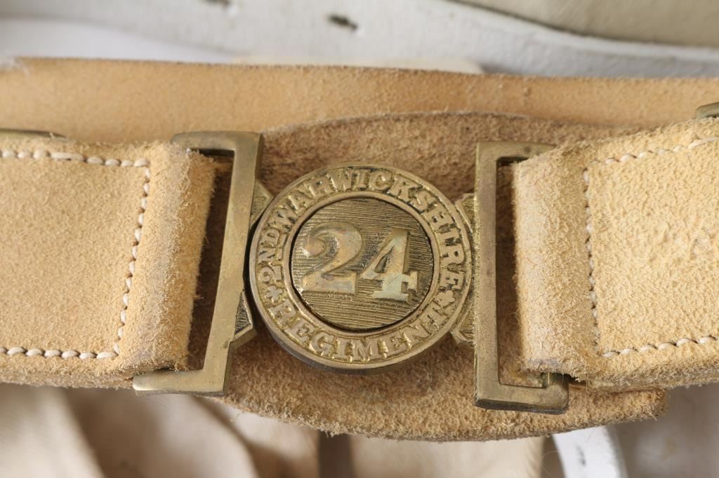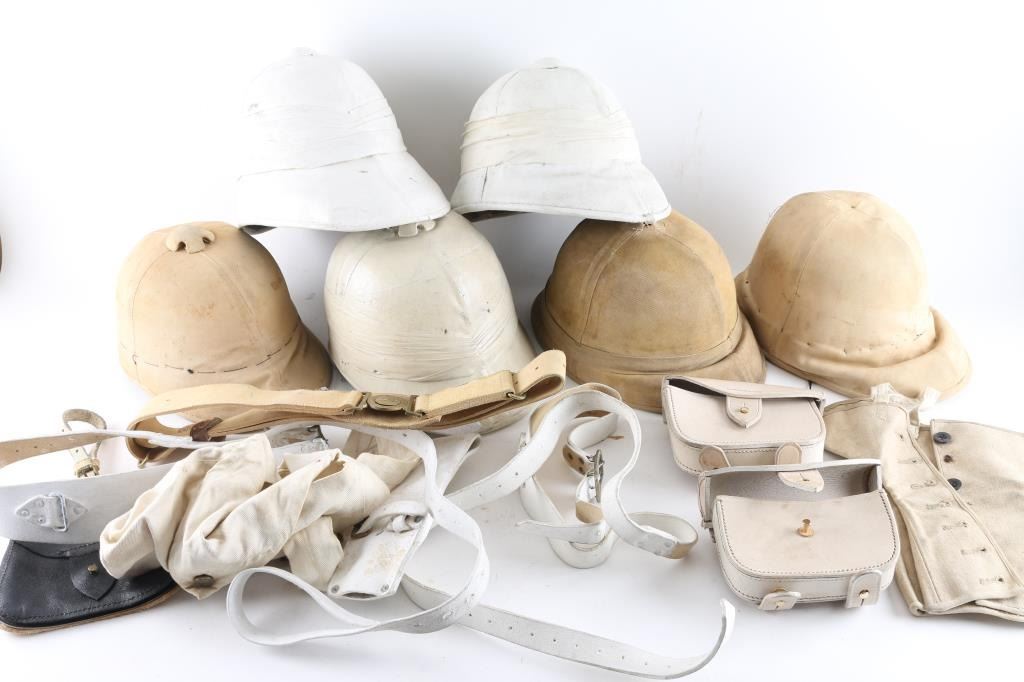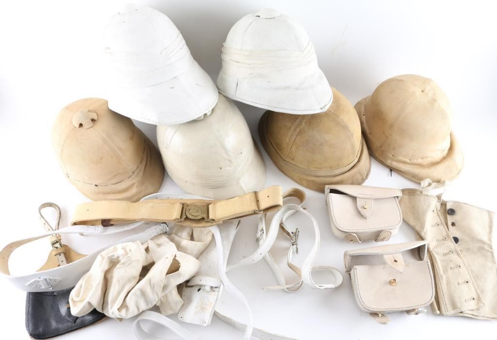From the Joe Musso Collection. 3 British 1902 pattern pith helmets painted white, 2 marked W.C.C. (Western Costume C0.), and 1 marked " Columbia Pictures, Hollywood", 3 tan Pattern 1902 pith helmets, 2 marked W.C.C., one unmarked, poor condition. 1871 Valise Equipment in Buff White Leather. Heavy White Buff Leather just like the original field equipment, as used by the British Infantry with the 577/.450 cal. Martini Henry Rifle. Comprised of: adjustable waist belt with brass 24th Regiment of Foot staple belt buckle, pair of cartridge box pouches, over the shoulder cross straps, leather bayonet frog , white cloth bag with shoulder strap, leggings, and black leather accouterments pouch.