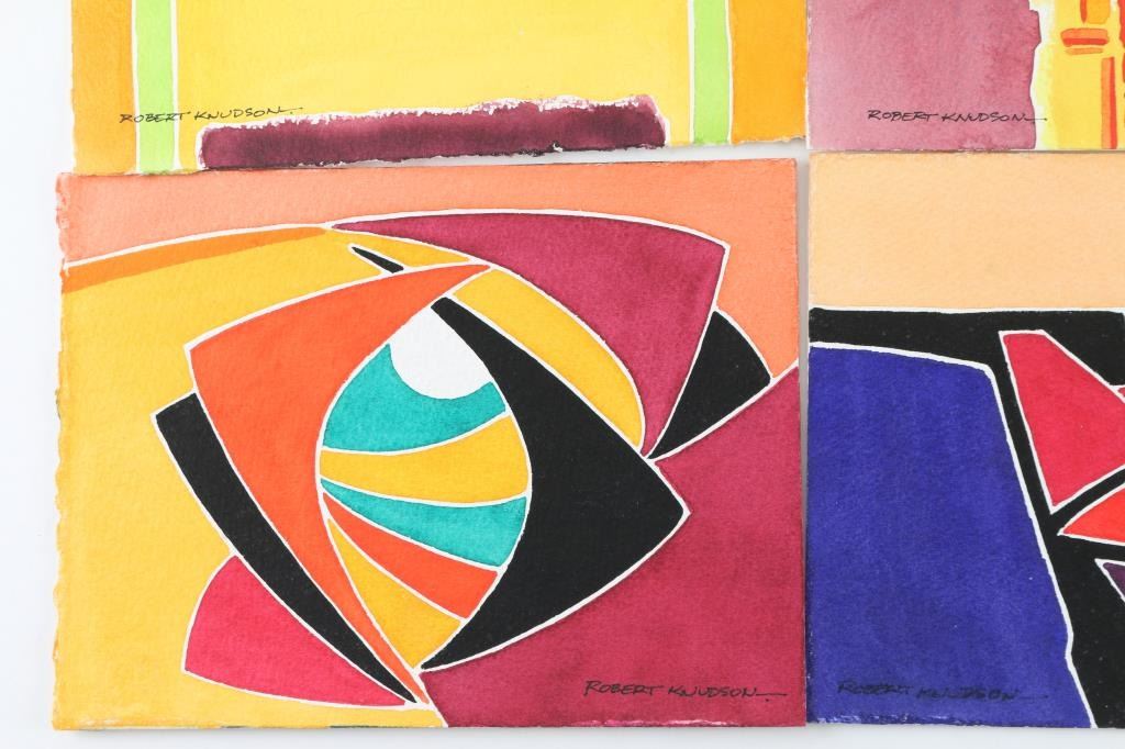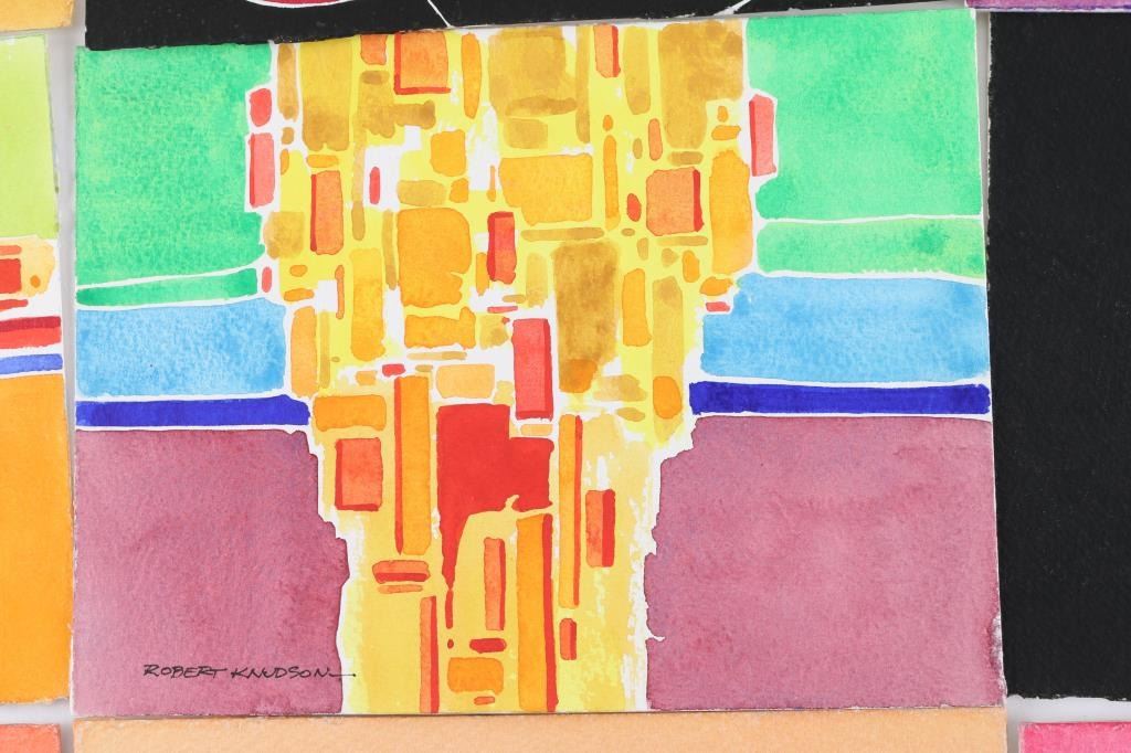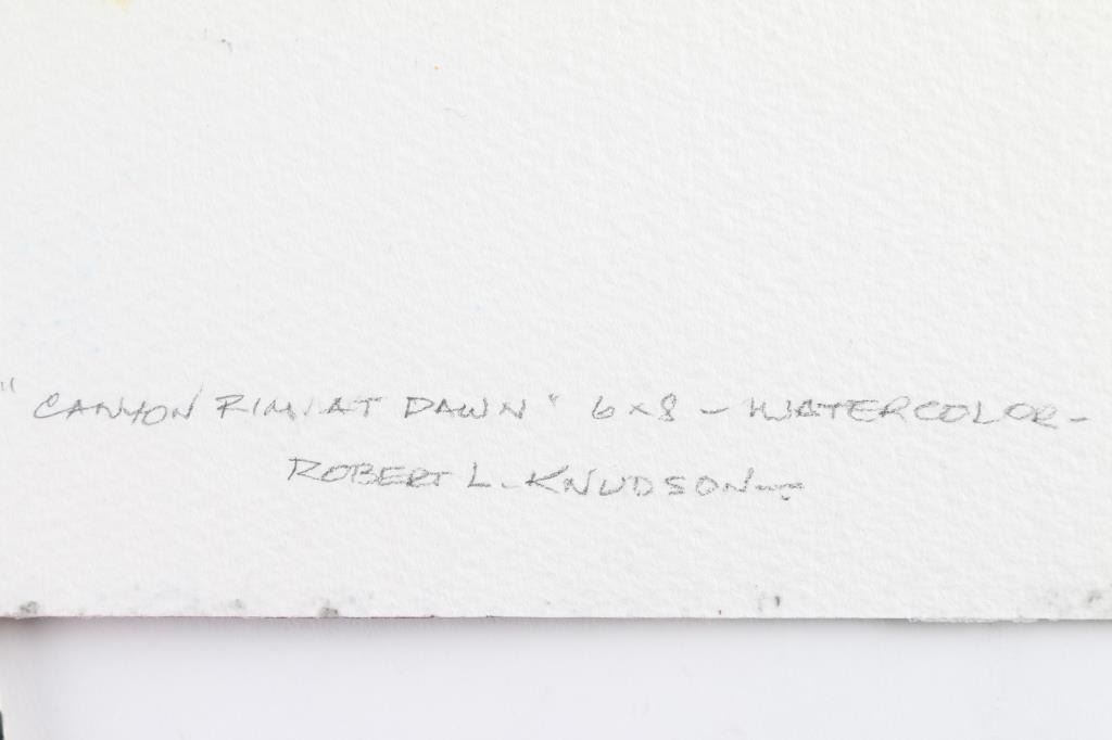 by Prescott Valley artist, Robert Knudson, five on board, "Rising Sun", Equipoise, "Canyon Rim at Dawn" and four on paper, "Earth and Sky", "High Flight", and Millenium Man. All measure 6x8. All signed. The work of Bob Knudson is represented in major collections through out the US including the William Penn Memorial Museum and the Museum of Northern AZ. His painting frequently appear in Arizona Highways and he has been member of the Mountain Oyster Club the oldest and most prestigious cattleman's club in the Southwest.