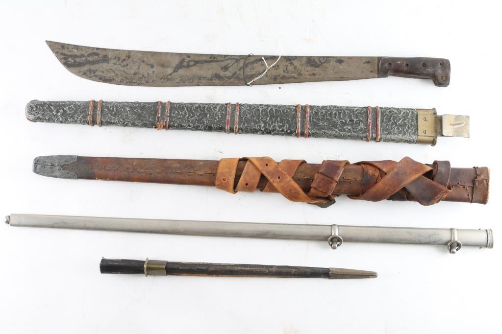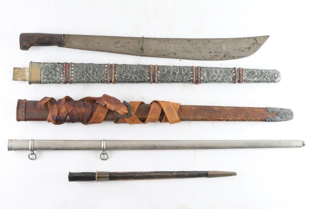 One Cruciform Bayonet, and three for sword, two appear to be movie props, also includes a machete. From the Estate of Joseph Musso.