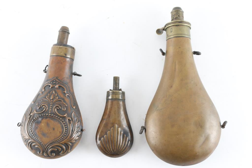(1) Measuring approx 4x2 with a fan motif (2) AM Flask Co. with adjustable dram measure, approx. 7x4 with floral motif. Nice patina. (3) Approx 9x5, smooth with some dents, A very nice antique 19th Century English Powder Flask by G & J.W. Hawksley (Sheffield), with adjustable dram measurer.