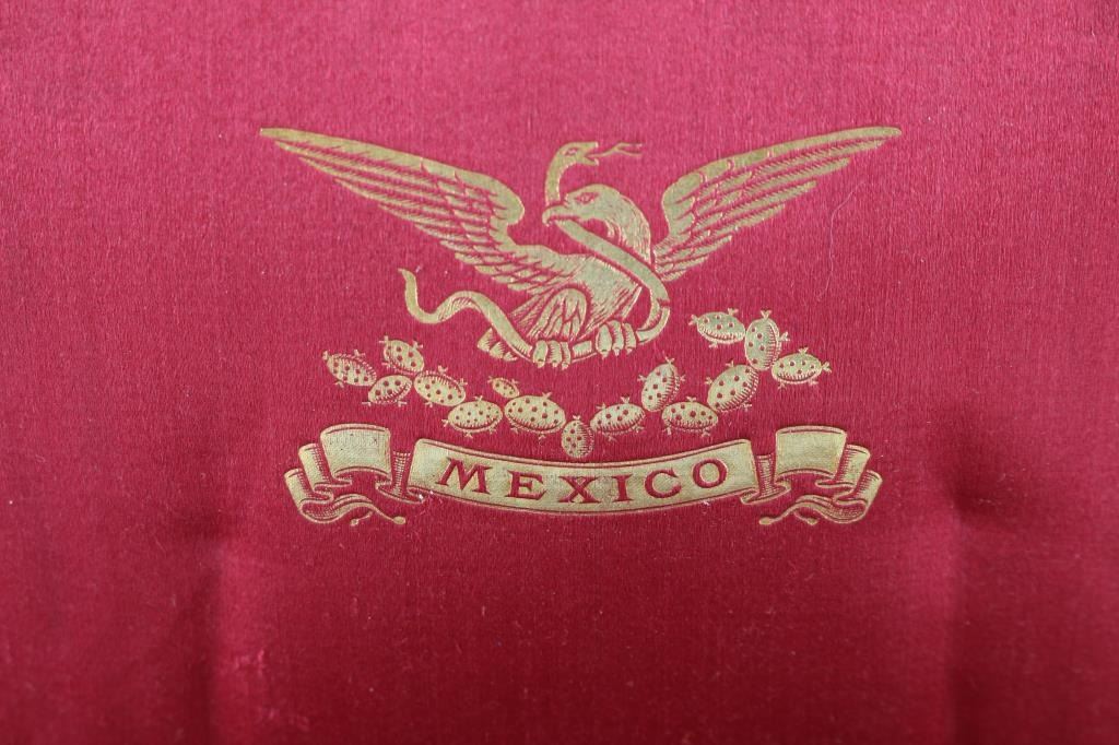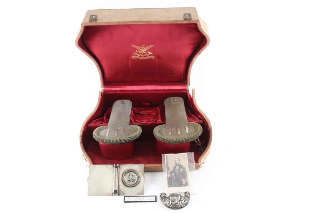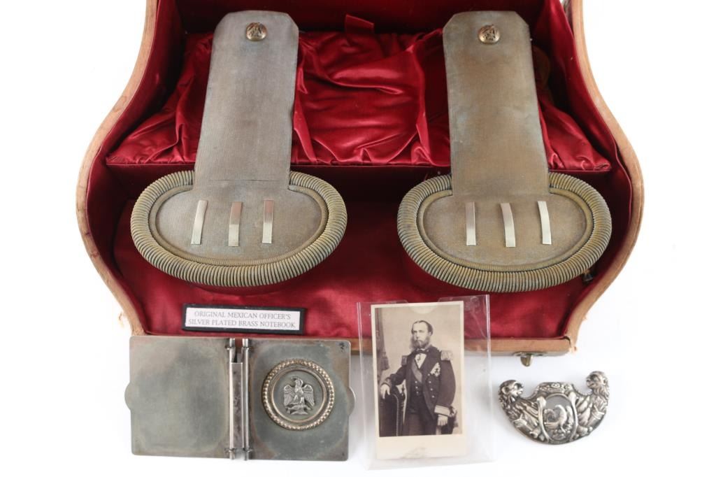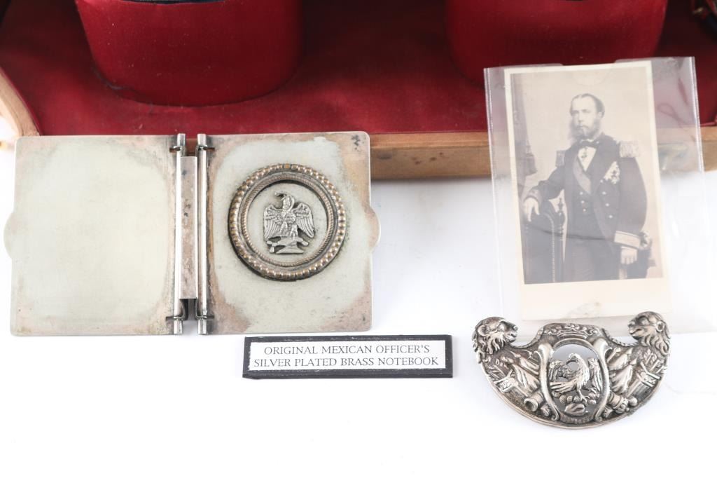From the Joe Musso collection. Believe from the the time of the 2nd Empire of Maximilian I; 6 July 1832 – 19 June 1867) was an Austrian archduke who became emperor of the Second Mexican Empire from 10 April 1864 until his execution by the Mexican Republic on 19 June 1867. Lot is contained in a beautiful wood Mexican epaulet box with brass fittings, and red silk lining. The interior lid has the Mexican Eagle/Snake with "Mexico" under it in gold, form fitted. A quality pair of silver bullion Mexican army Captains Epaulets, French made with Eagle/Snake buttons, blue felt underside. Although this box was made for epaulets with tassels, officers would have different epaulets, parade, daily service. Nice carte de visite of Maximilian in dress uniform, signed on the back is Emp. of Mexico" in French, very old handwriting, definitely period. A nice Mexican officer's silver plated brass note book with Eagle/Snake in wreath on the cover. Eagle/Snake uniform button. A silver cap badge with Mexican eagle, and a period hand painted lead soldier of a Mexican officer. These original items are very scarce to find these days. Box has some scuffs & separation on the sides.