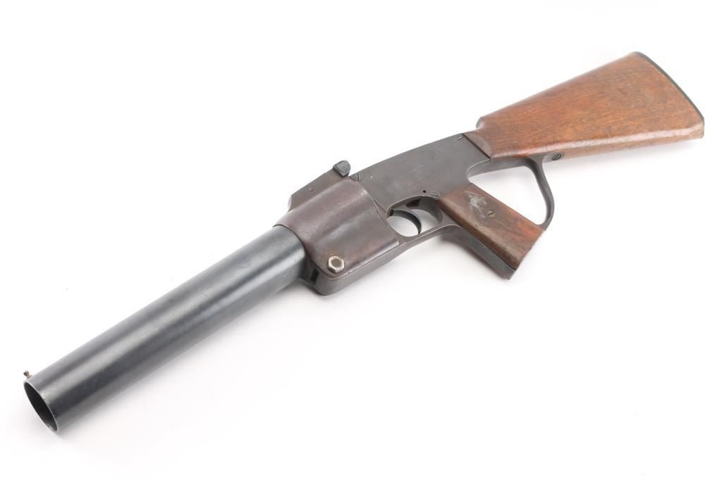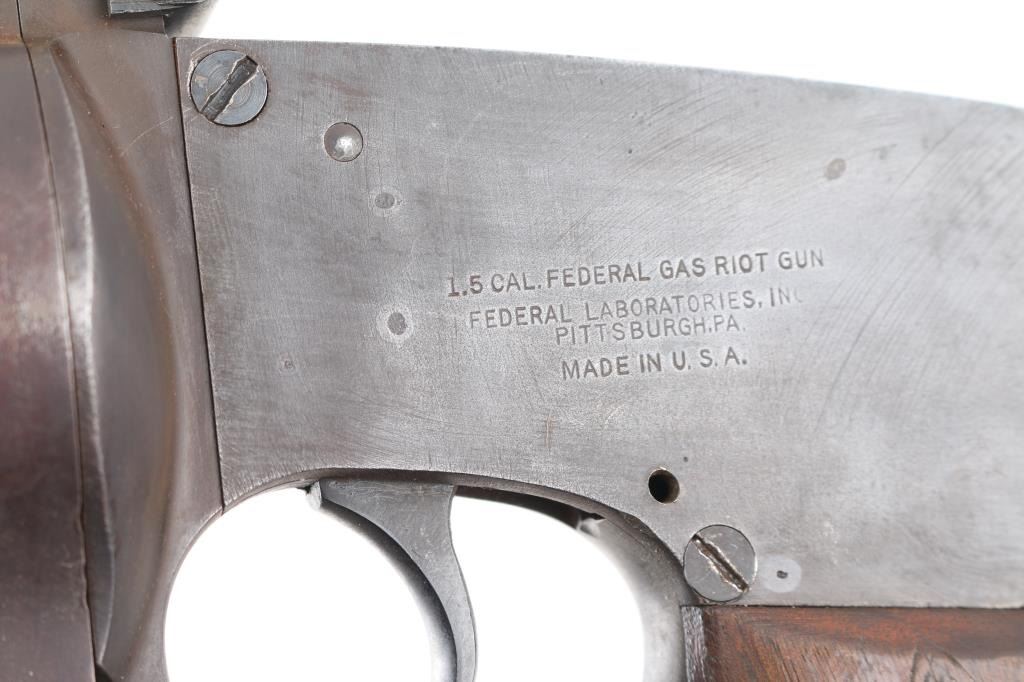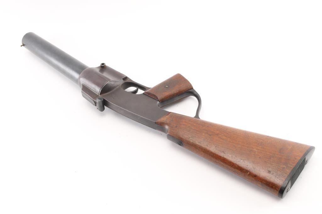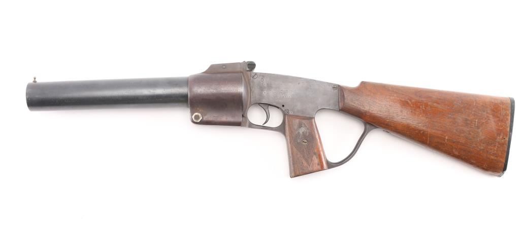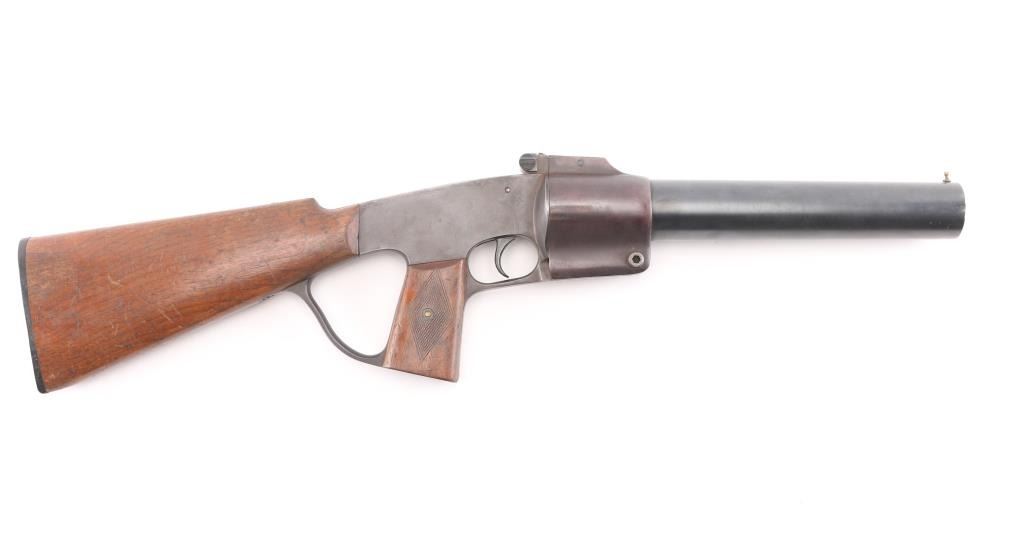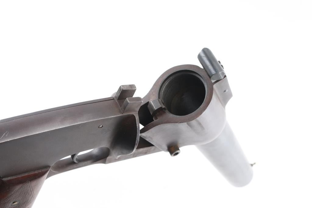 Early model gun with steel receiver & barrel. Marked "1.5 CAL". Blued finish shows color variations. Walnut grip panels & shoulder stock. Brass bead front sight, fixed rear sight on barrel latch. Double action trigger. Black composition butt plate. Bore is very good. Retains 90% finish, showing fading and color changes. Wood is good overall, checkering on grip panels possibly added later. Loss of wood and chip from buttplate at toe. Action is sound. Pivot pin replaced with hardware store hex bolt & cap screw. Condition is NRA Very Good