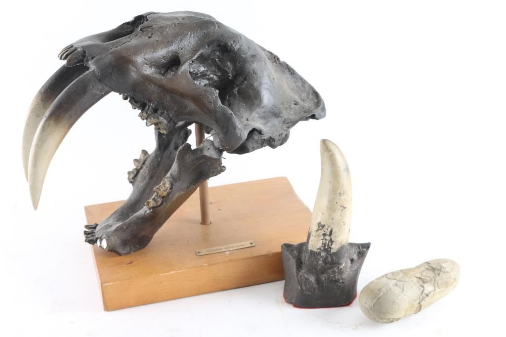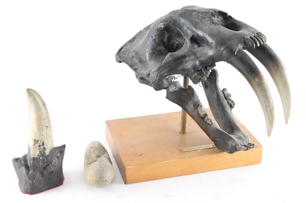 (1) Dinosaur egg (2) Smilodon Californicus aka Siber Tooth Tiger, has a couple teeth missing. (3) Tyrannosaurus Tooth cast from the largest T-Rex Maxilla found to date in Montana. From the Estate of Joseph Musso Collection.