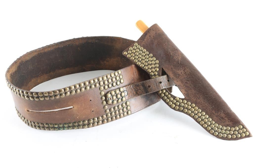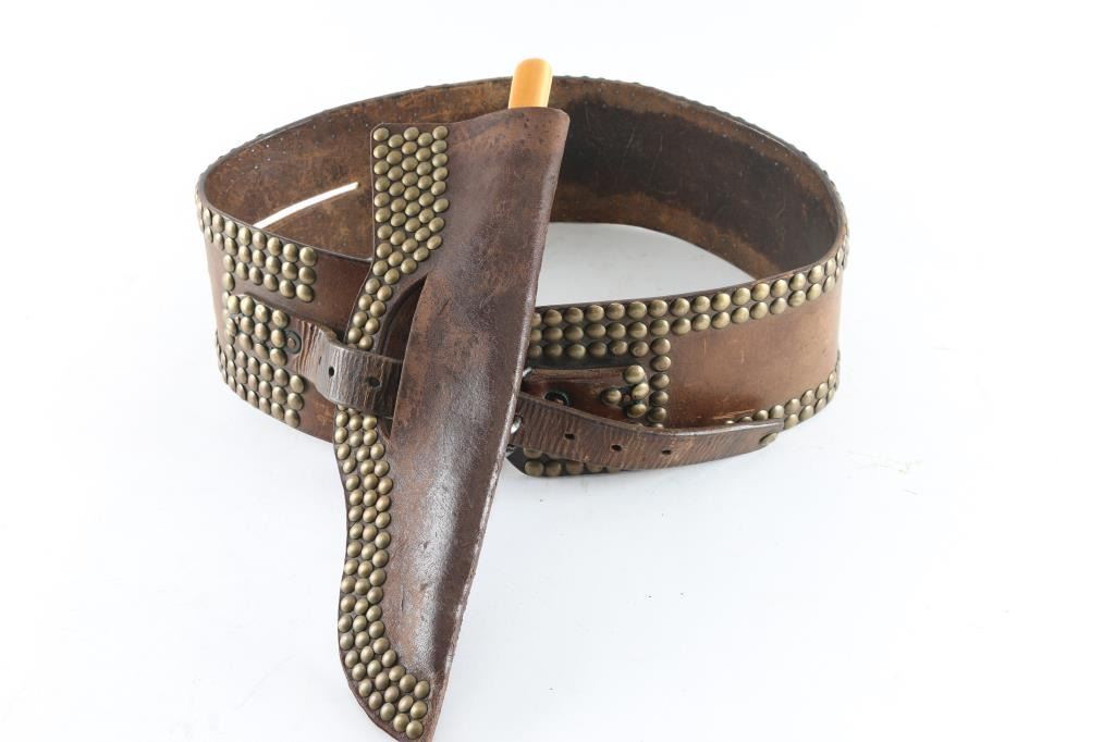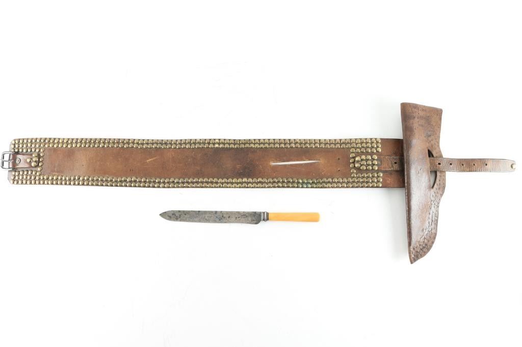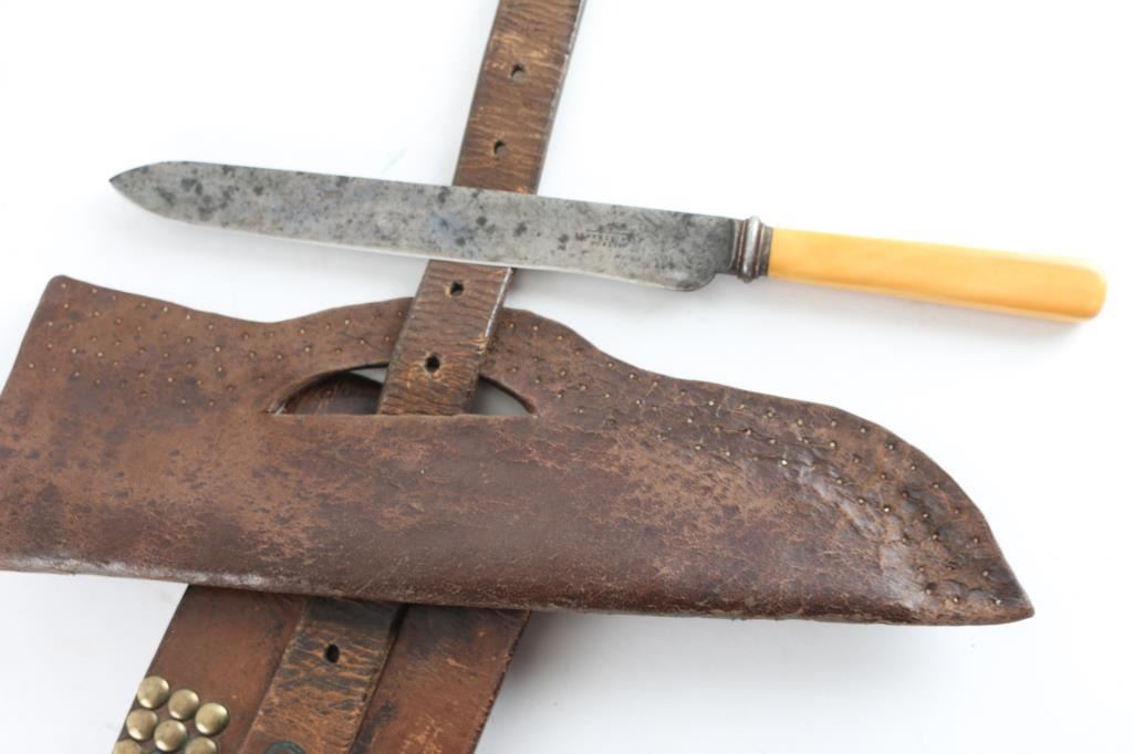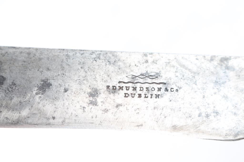 Edmundson & Co trade knife, made in Dublin, Ireland, 14" overall with a 9" blade. Includes a smooth, brown leather belt and sheath with round, brass tacks.