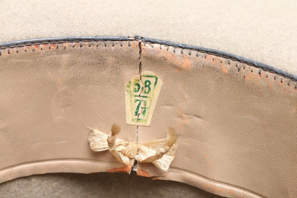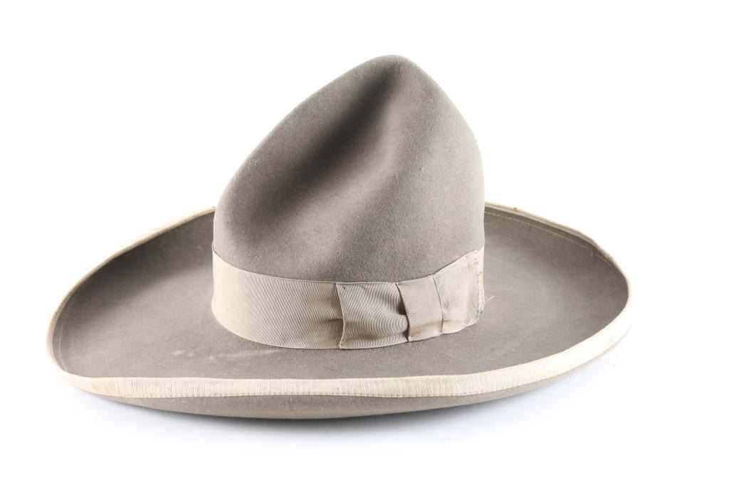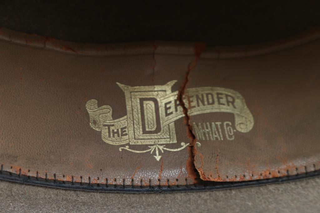 called the "Defender" is made with vintage felt, size 7 1/4 rolled brim, 2" ribbon, 7 1/2" crown, 5" brim with a "Charlie White" crease. The band is torn on the inside. The outside is in fair condition with shredding on the ribbon along with outer edge and some areas of discoloration and rubs.