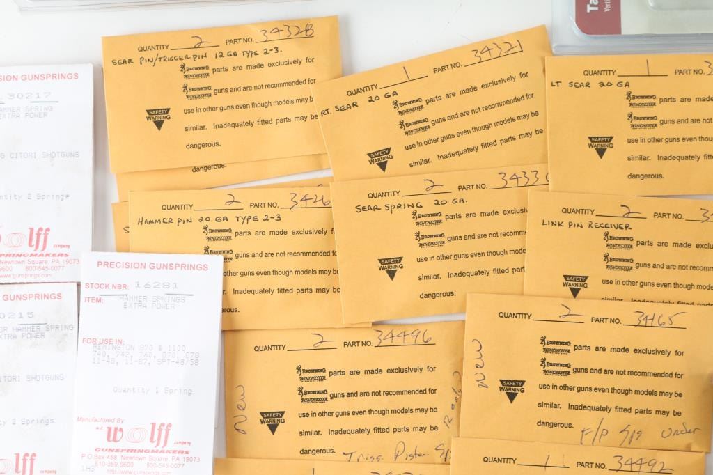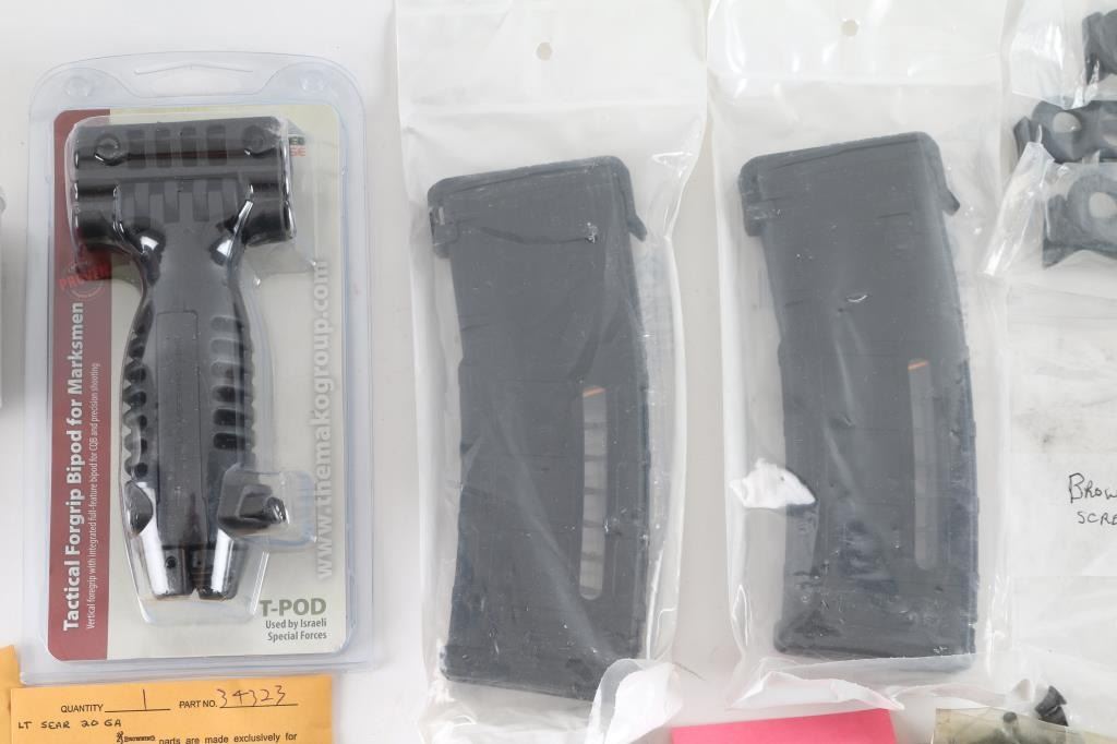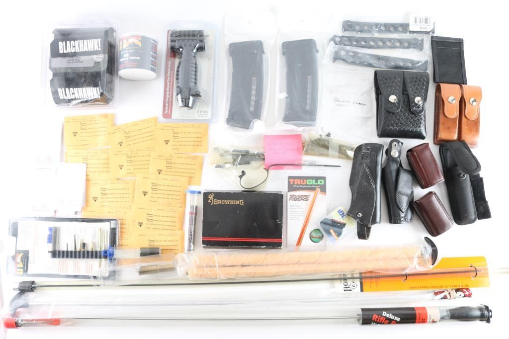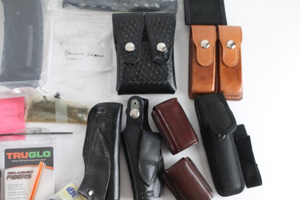 Includes: parts for Browning Citori shotguns, English 20 Ga. trigger guard/screws, pins, sear, sear springs. Parts for 12 Ga. - hammer pins, trigger pins, sears & others; 3 - 12 Ga. chokes, IC/CYL/Skeet, 2 - Briley 20 Ga. chokes M/F; 2 - PMAG 30's; 2 - Bianchi holsters for 9mm Hi-power; 2 - double mag pouches & 2 single mag pouches; Fab Defense Bi-pod, Blackhawk Serpa holster paddle. Cleaning supplies include: Cleaning rods - 36" & 33" & shotgun brushes, by KleenBore & Hoppe's; Otis 3" cleaning pads, 6" Q-tips & tool set.