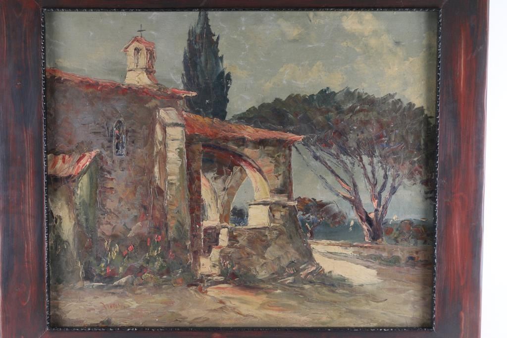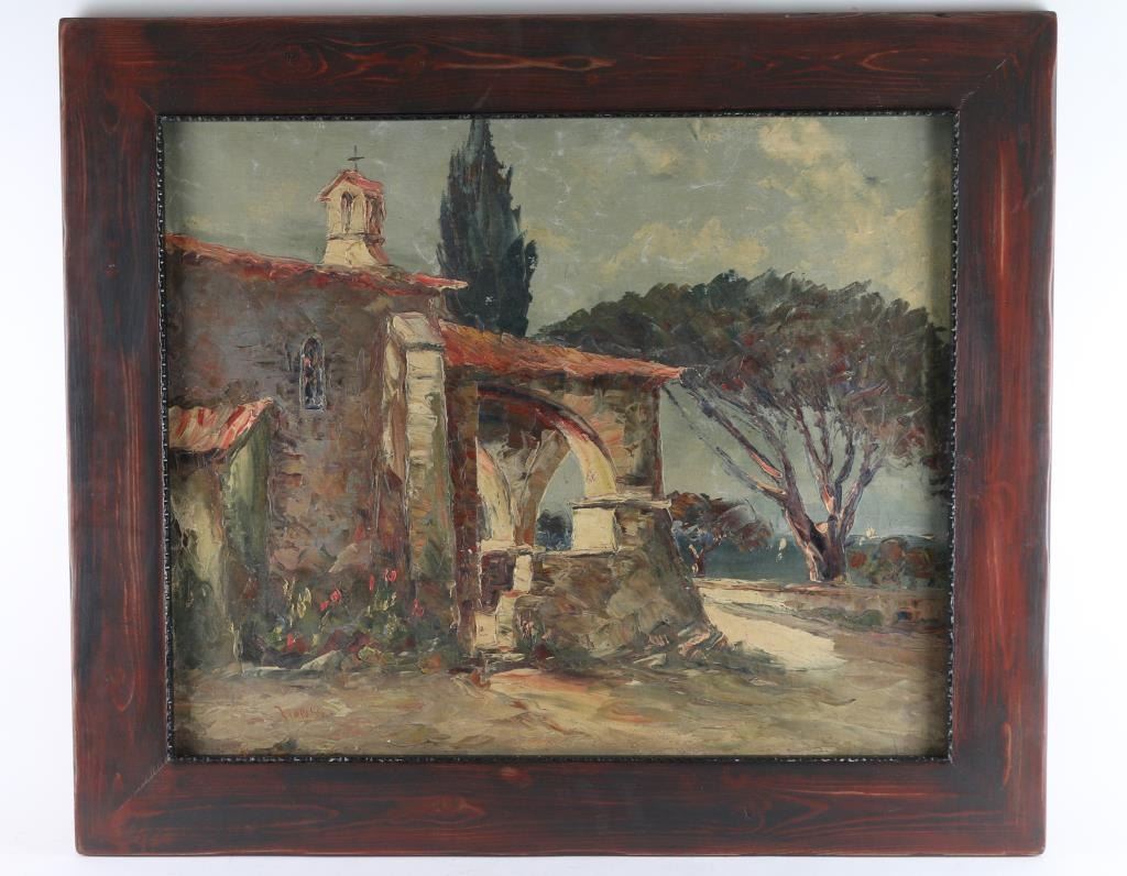 by artist "Zioness" depicting California mission, signed lower left. This piece shows signs of age with coloration faded and hard canvas surface. Framed in wood frame, image size measures 28x22.