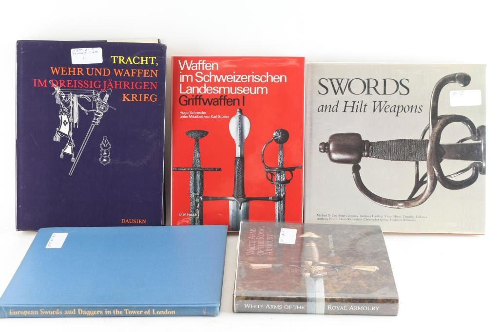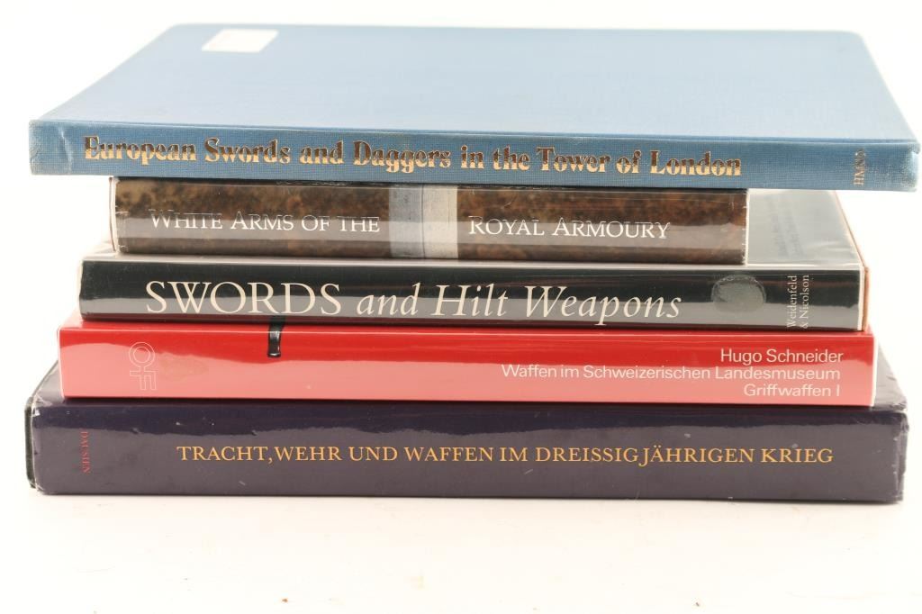 about European swords including: (1) White Arms of the Royal Armoury by Lena Nordstrom. Copyright: The Royal Armoury. Printed in Sweden with general financial assistance from the Royal Armoury Foundation. Excellent condition. (2) the Landes Museum copy of Hugo Schneider, Waffen im Schweizerischen Landesmuseum, Griffwaffen I. Excellent condition. New in original packaging. (3) European Swords and Daggers in the Tower of London, by Arthur Richard Dufty, Master of Armouries, a Blake Book, London: Her Majesty's Stationery Office: 1974. Minor rubs on spine. Good condition. (4) Tracht, Wehr Und Waffen, Im Dreissig Jahrigen Krieg by Dausien. Slight rubs on the bottom of the spine. Good condition. (5) Swords and Hilt Weapons. First published in Great Britain in 1989; Copyright by Multimedia Books Limited 1989. Excellent condition.