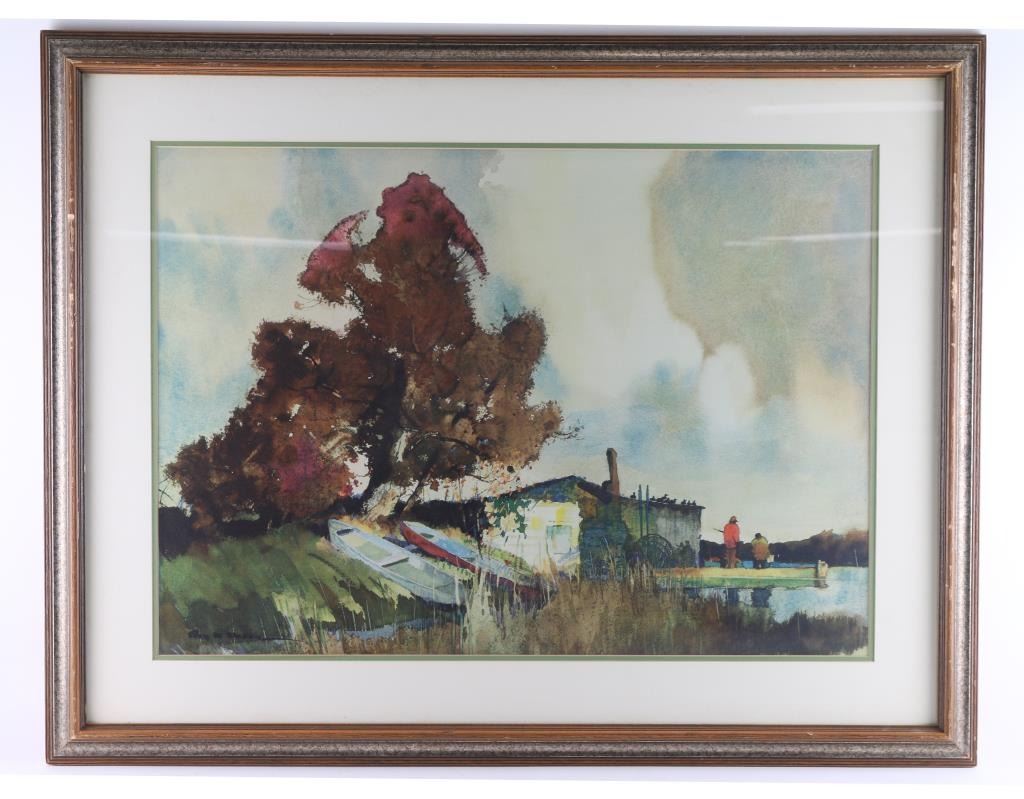By artist "Roy Mason" depicting hunter waiting for ducks, unsigned or numbered, this piece is triple matted and framed in wood frame . Image size measures 29x21