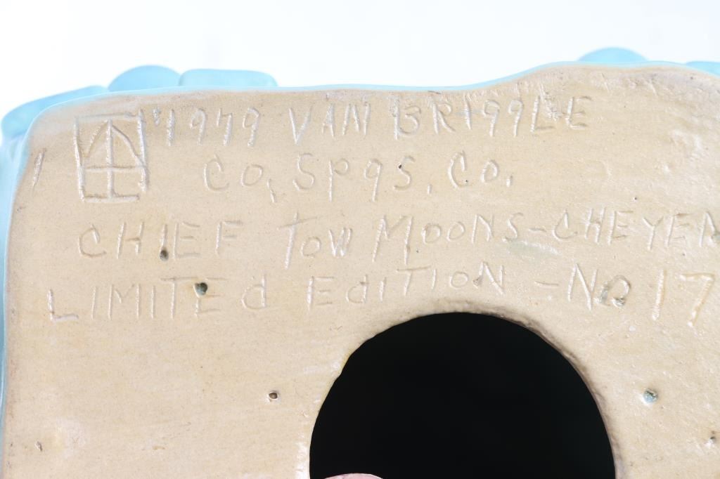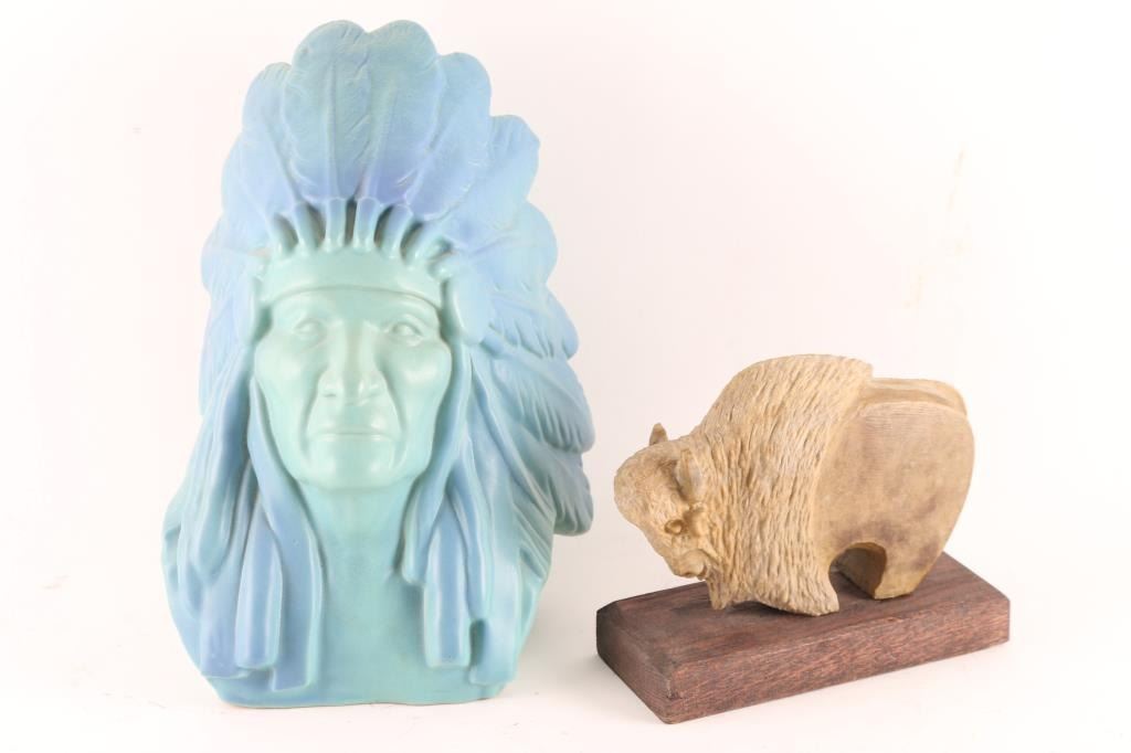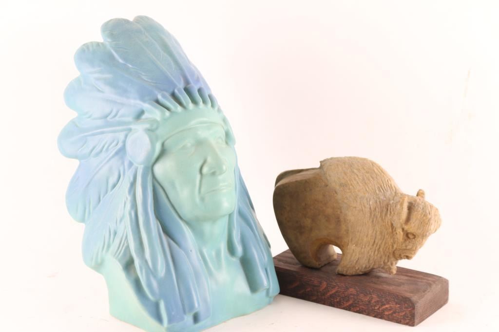 including a Van Briggle Indian Chief statue in green/blue finish. 13"x7"; also included is a stone carving of buffalo made by Richard Sphill, measuring 8"x7".