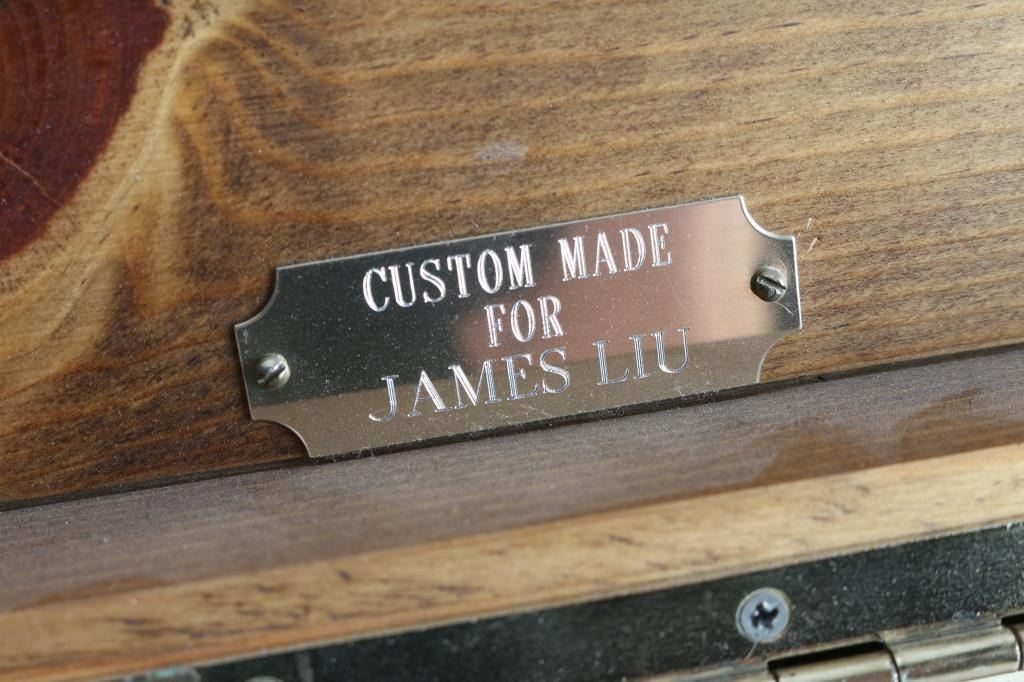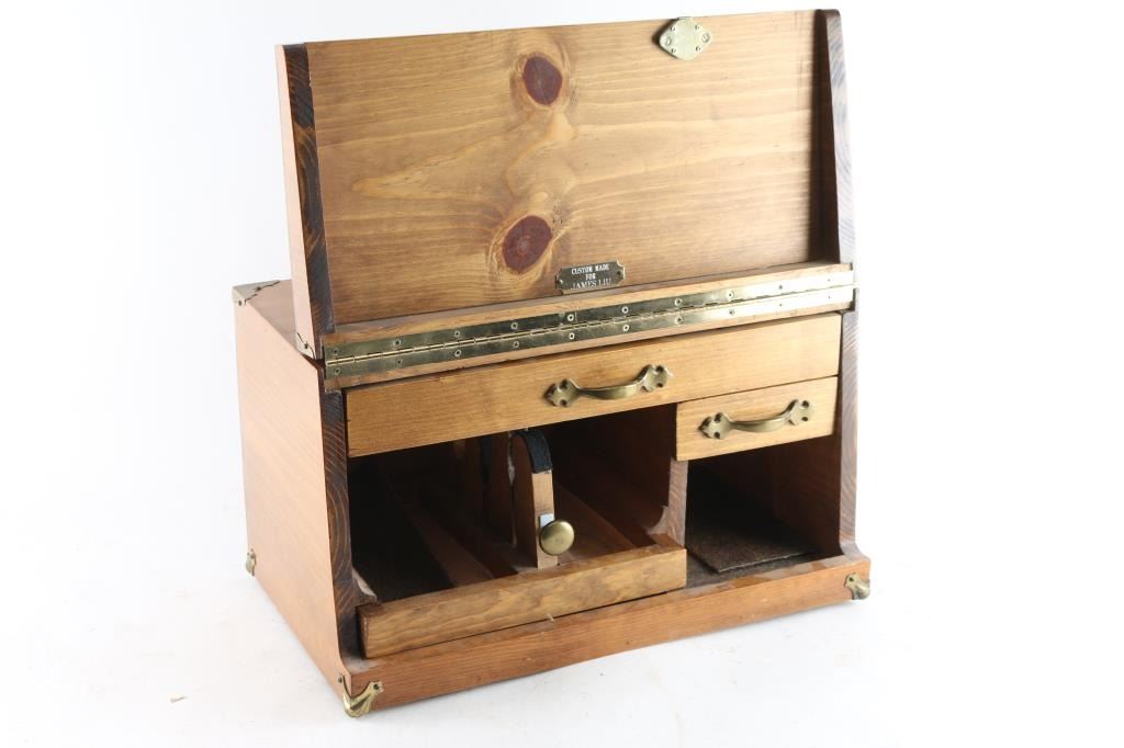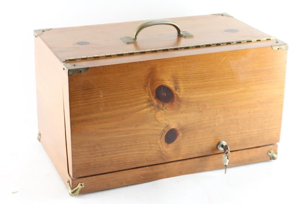 Lacquered wood finish. Felt lined holds 3 handguns. Has 2 drawers & lock w/key.