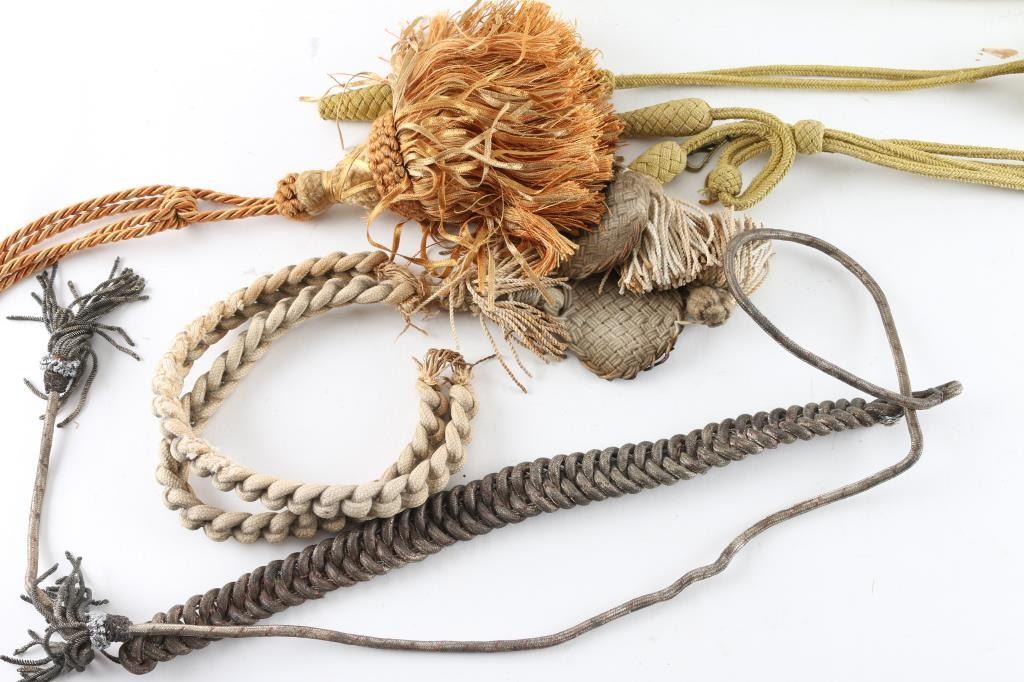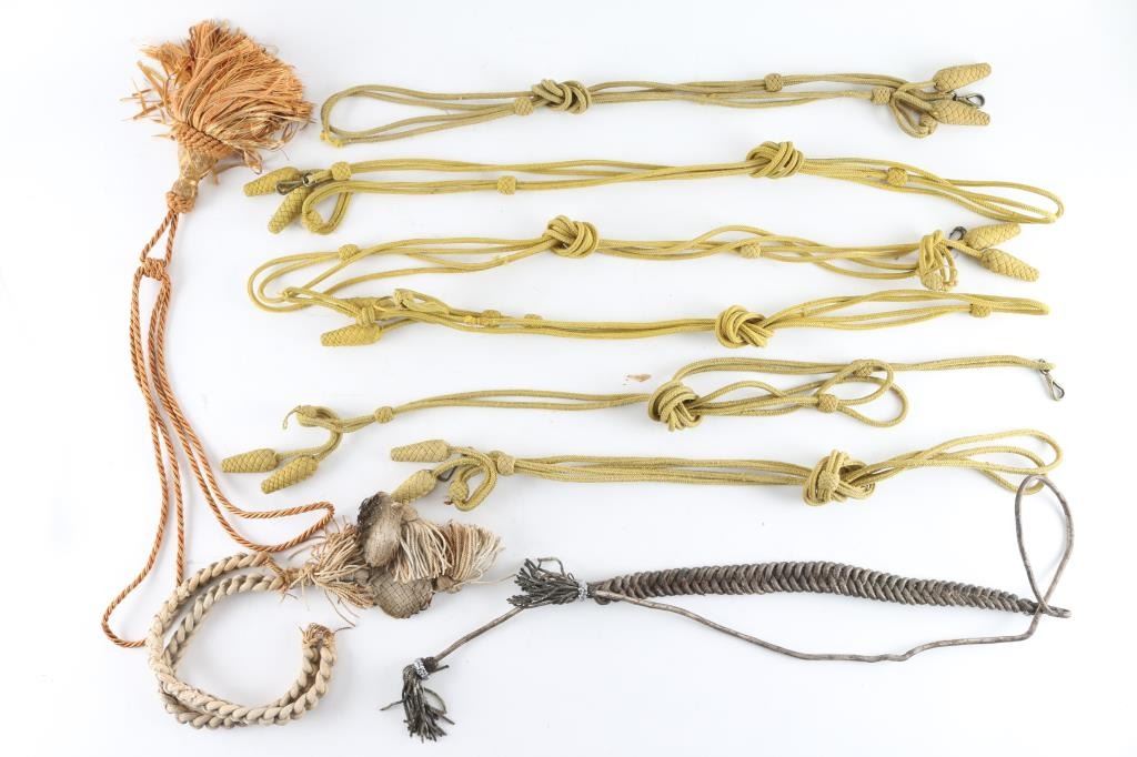 Nine Total. All original. Six British yellow "Acorn" style Lancer cavalry cords with brass fittings for the lancer cap. Complete, very good condition. 3 French style helmet cords with tassels. One is Shako cord Grenadier Napoleonic era, some fraying, overall good condition. Hard to find to complete your helmet. These cords demand high prices. The Lancer cords sell for $200.00+ on Ebay.