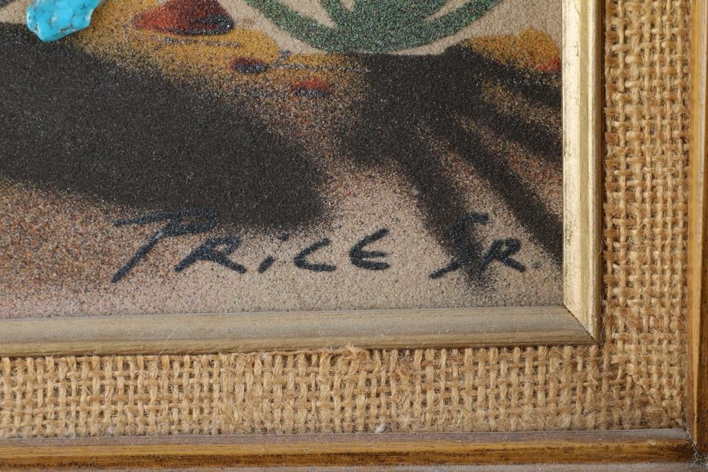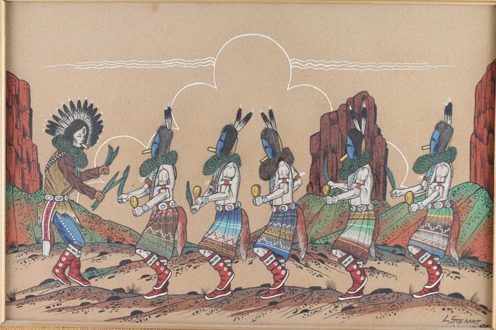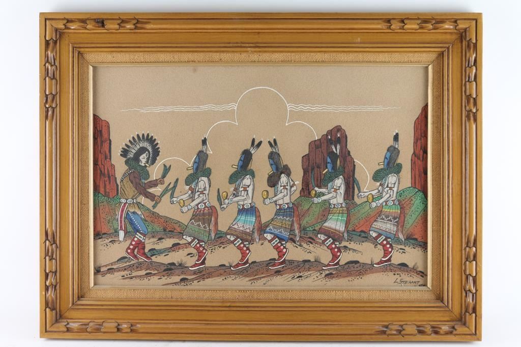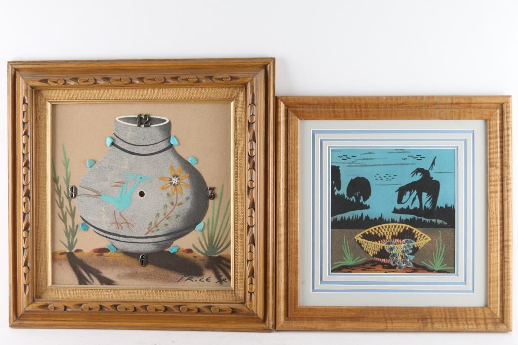 (1) Kachina Dancers by Lorenzo Stewart, Image size 24"x16" (2) End of the Trail, measures 8"x8". (3) Sand Painting with hole for clock by William Chris Sr., 11x11".