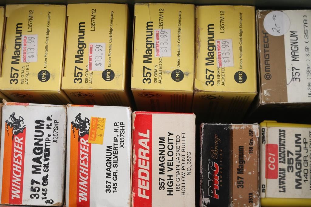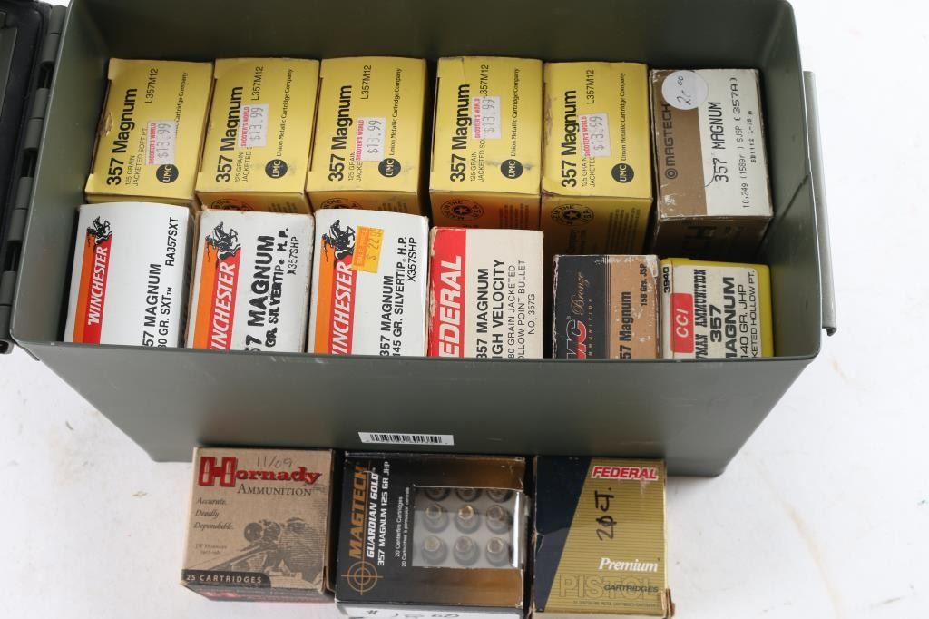 Approx. 665 rounds of 357 Magnum factory new ammunition. Various makers, Grains & bullets, all in metal ammo can.