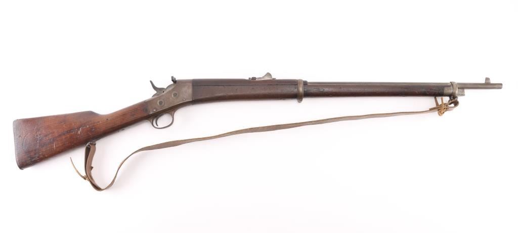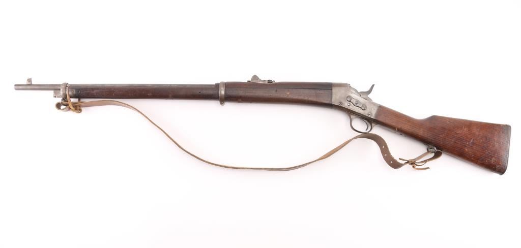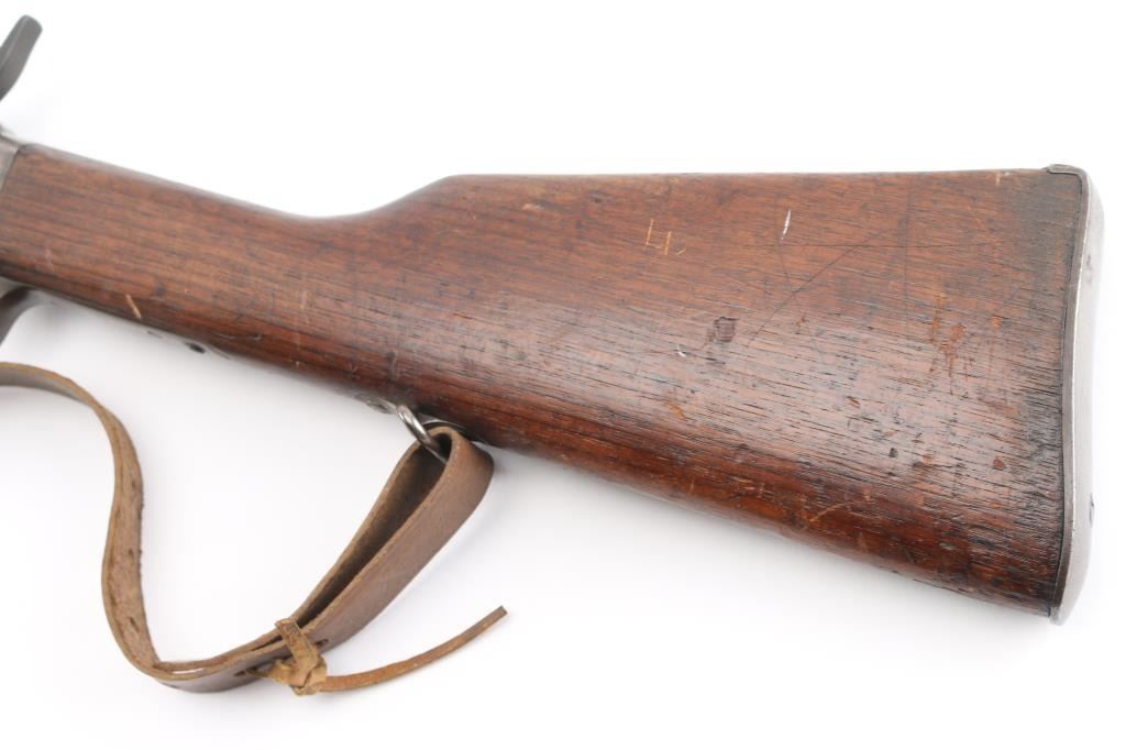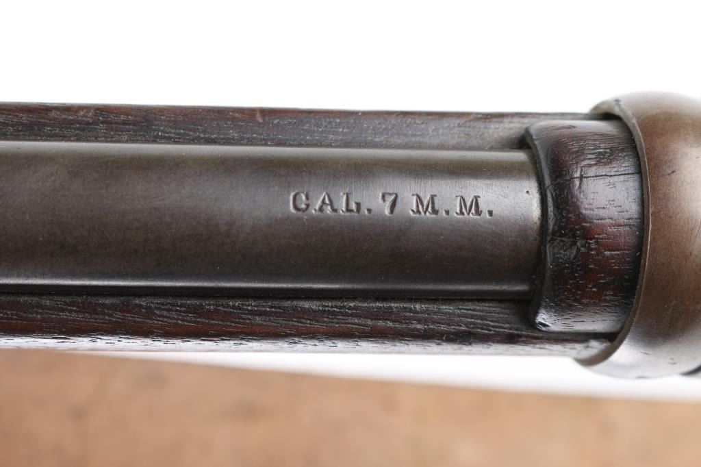 Made under a South American contract with "REMINGTON ARMS CO. / ILION.N.Y. U.S.A. / PAT'D OCTR. 22ND, 1901." marked on the upper tang and "CAL. 7 M.M." on top of the barrel in front of the handguard. The barrel bands are marked "U". Stamped on the forward triggerguard is "H". The rear sight is graduated to 21. The metal finish has turned a gray/brown patina, marking are crisp/clear, full forearm with handguard, missing cleaning rod, bayonet lug and straight grip stock with a steel buttplate and sling swivels .Incorrect brown leather sling attached. Bore is good with strong rifling with scattered light pitting, action is smooth/tight, wood is very good with minor scratches/dings. Manufactured 1901-1909. NRA Condition-Good. C&R Firearm.