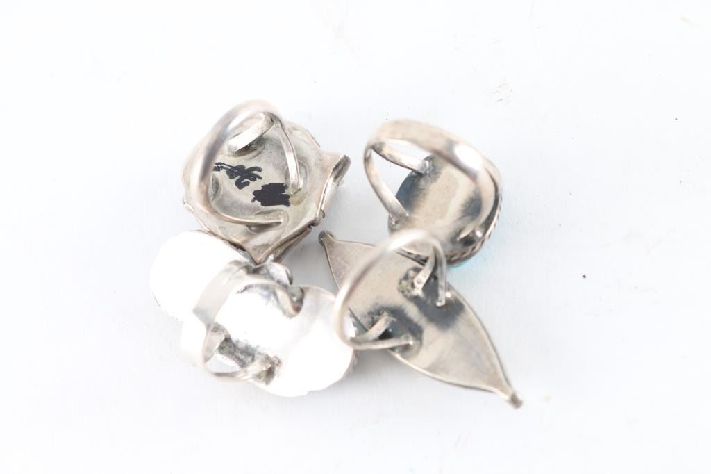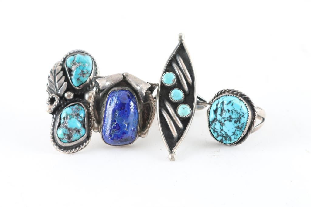 All sterling silver (1) single turquoise lightly polished rough stone, size 8, with rope accent (1) a double turquoise lightly polished rough stones, size 4, with feather and rope accents (1) three tiny lightly blue turquoise stones, size 8 1/2 (1) Lapis Lazuli stone, size 6, with rope and flower accents