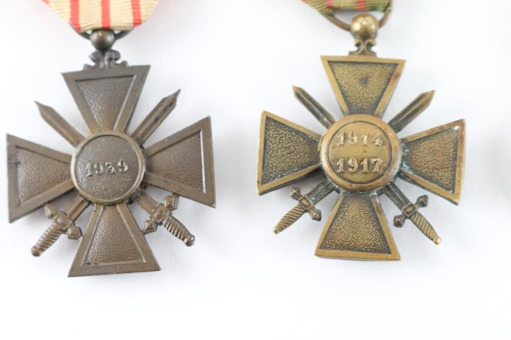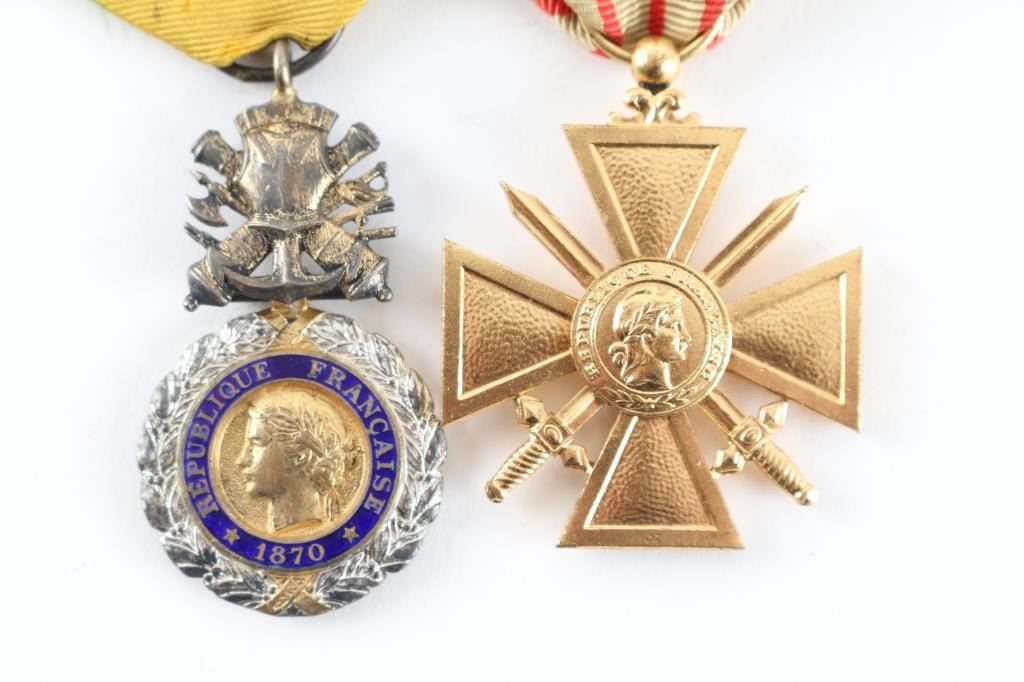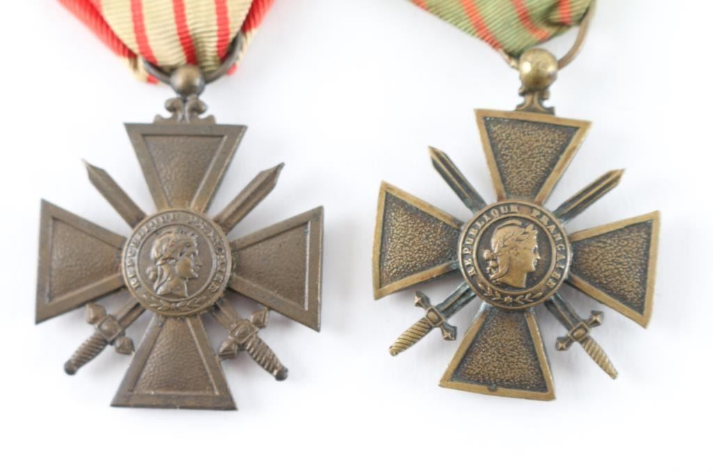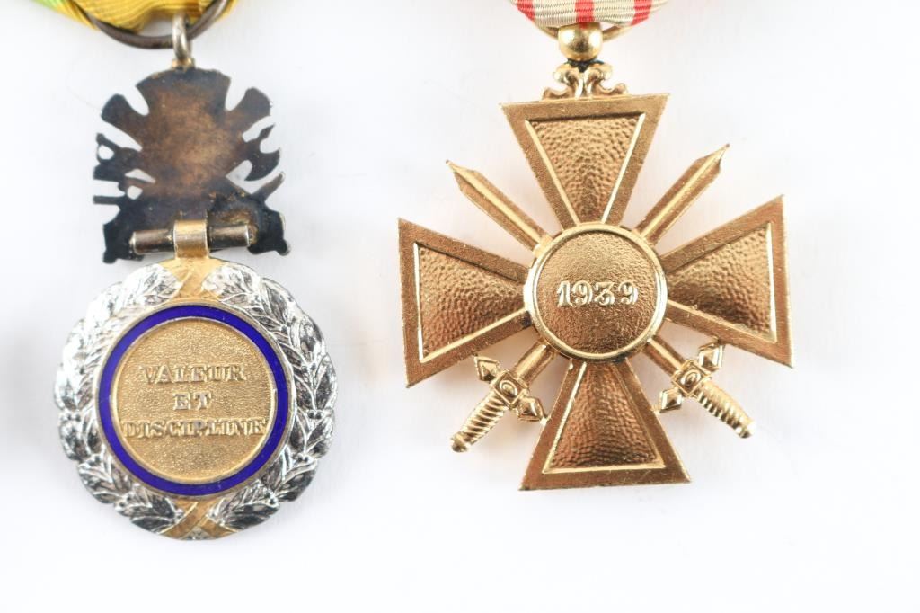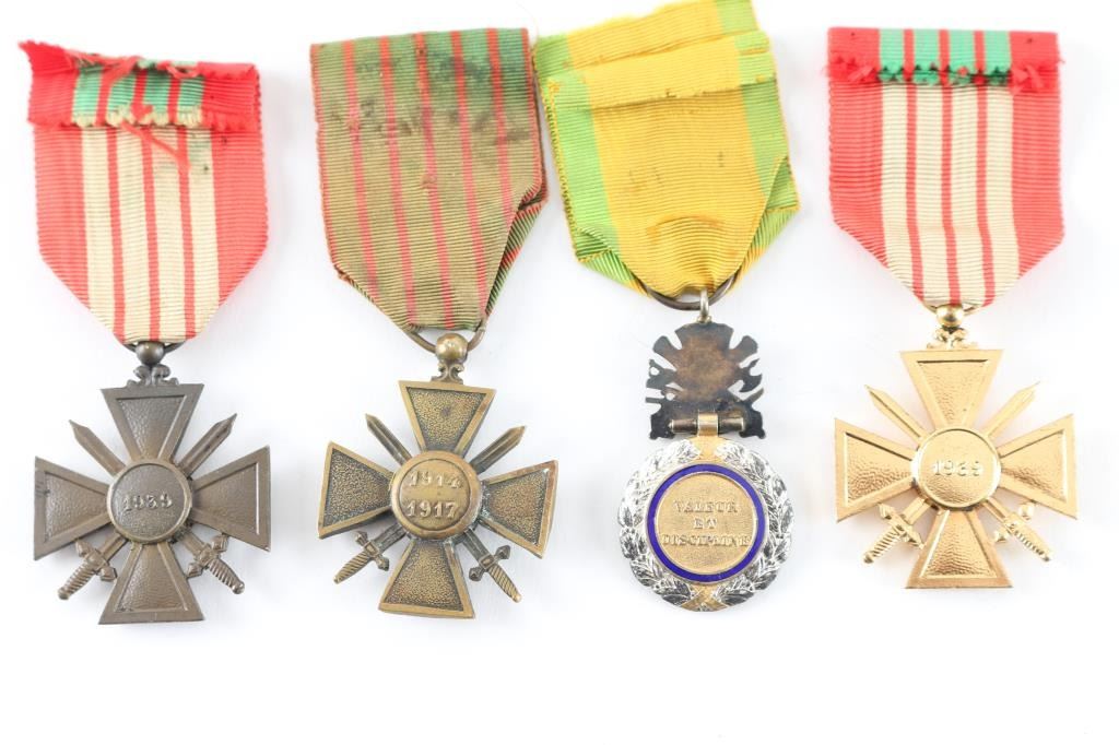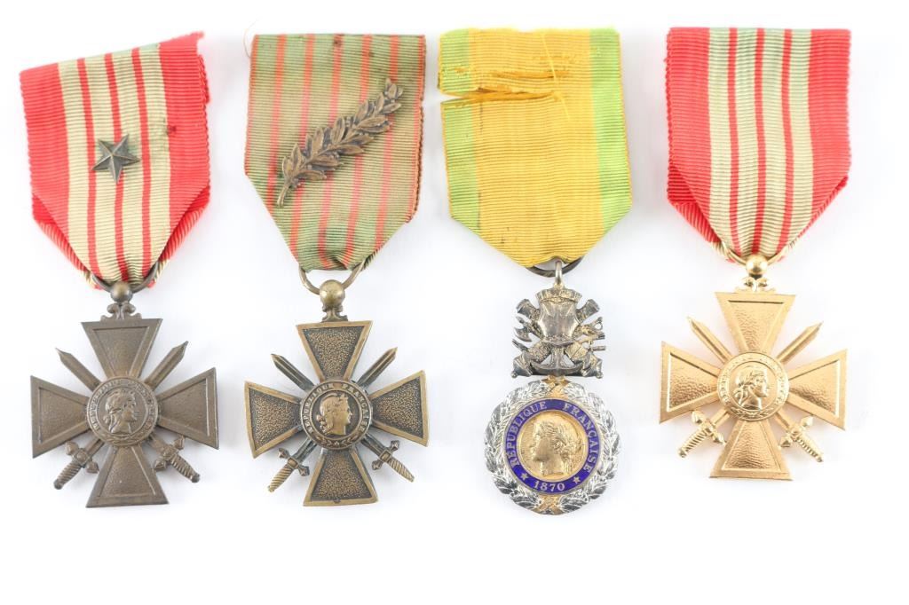 Four Total. 1) Military Medal. 4th republic (1870-1940) Silver laurel wreath, wrapped around a central gold medallion bearing the left profile of Marianne, effigy of the French Republic. The central gold medallion is surrounded by a blue enameled ring bearing the gilt inscription "RÉPUBLIQUE FRANÇAISE" ( "FRENCH REPUBLIC") 3rd Republic variant bore the date 1870, topped by a device composed of a breastplate superimposed over crossed cannons, a naval anchor, sabers, swords and battle axes, to which the suspension ring passes through a loop for attachment to a ribbon. The reverse of the medallion is "VALEUR ET DISCIPLINE" ( "VALOUR AND DISCIPLINE ) 2) French WW1 War Cross (1914-1917) with a bronze palm awarded with the Croix for mention in an army dispatch.3) French WW2 War Cross (1939-!945) with a bronze star for Brigade and Regimental citations. 40 Same as above without star. Restrike. All in very good condition with original ribbons.