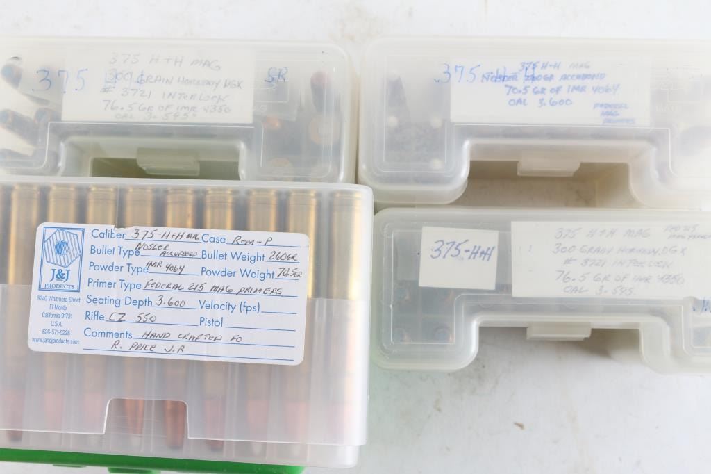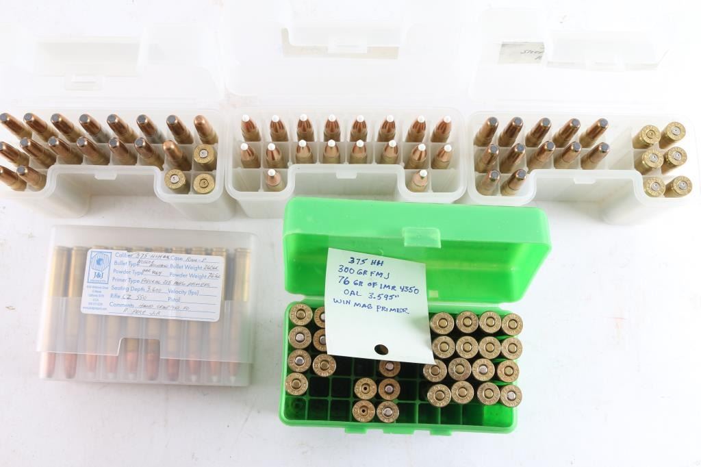 Approx. 92 rounds of reloaded .375 H&H Magnum w/19 spent brass cases. All in plastic containers.