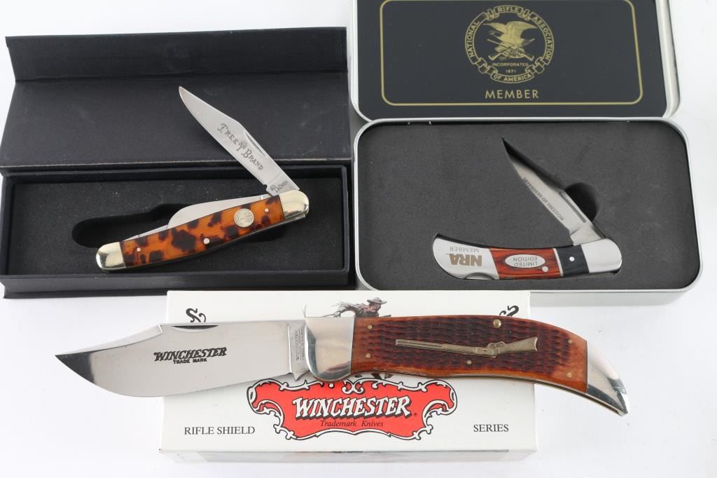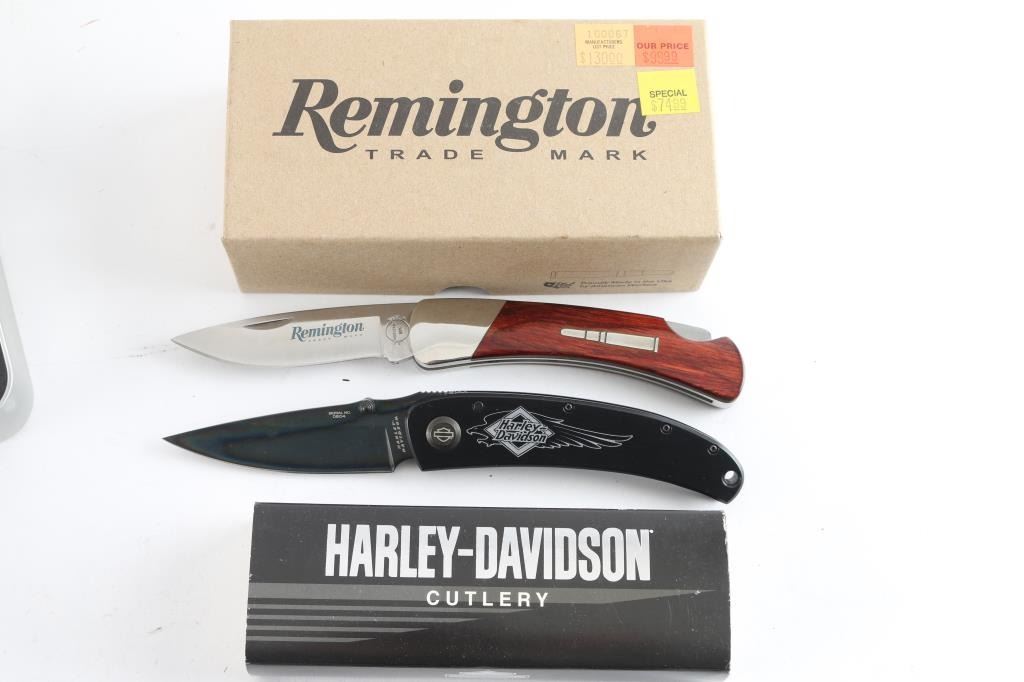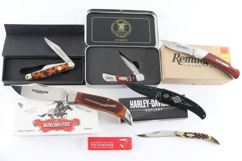 include trade marked brand names: Remington, Winchester, Harley Davidson. Also Boker, Victorinox. All like new in original boxes. Seven knives total.