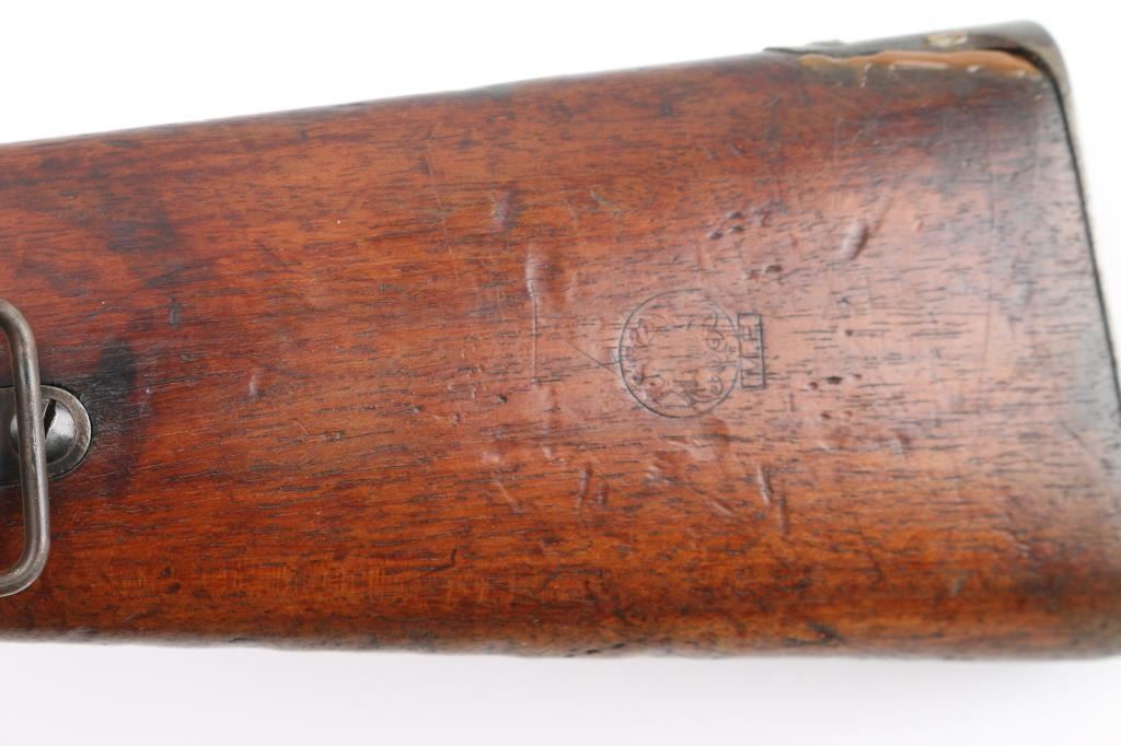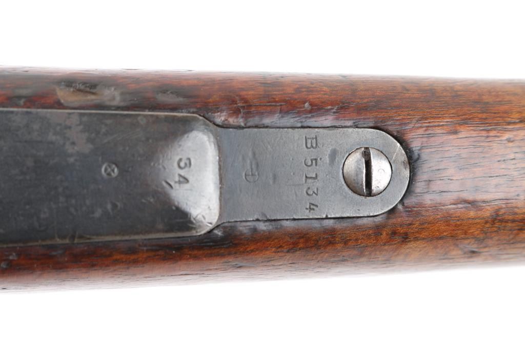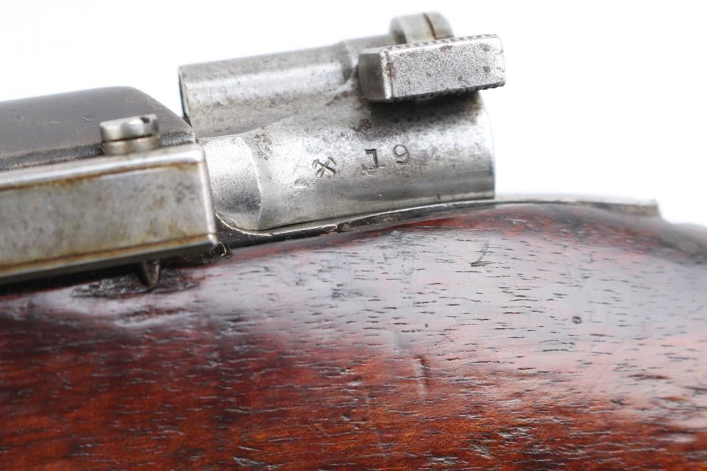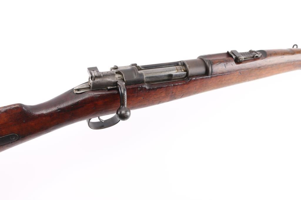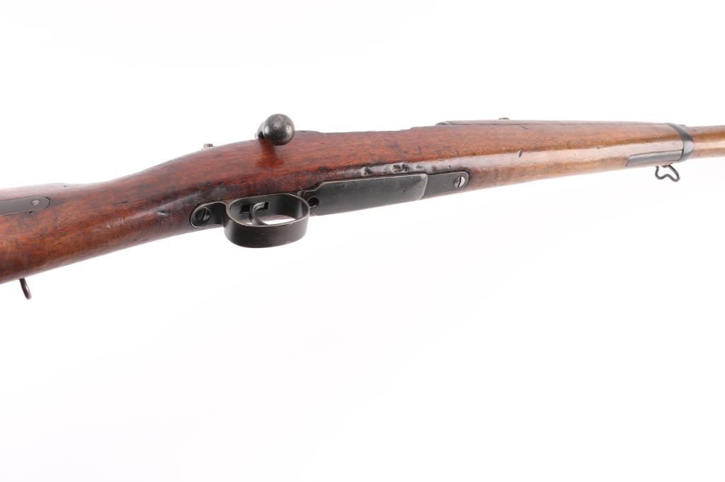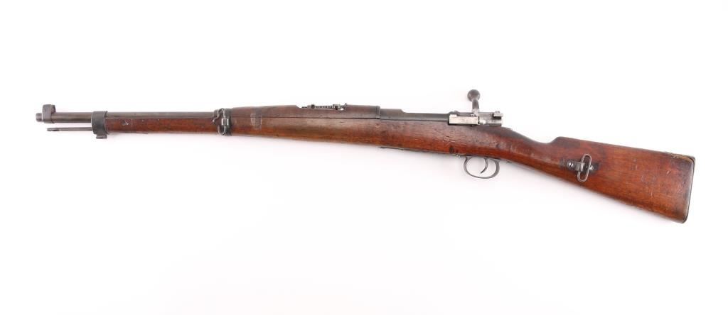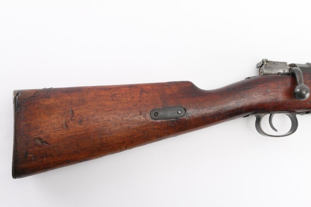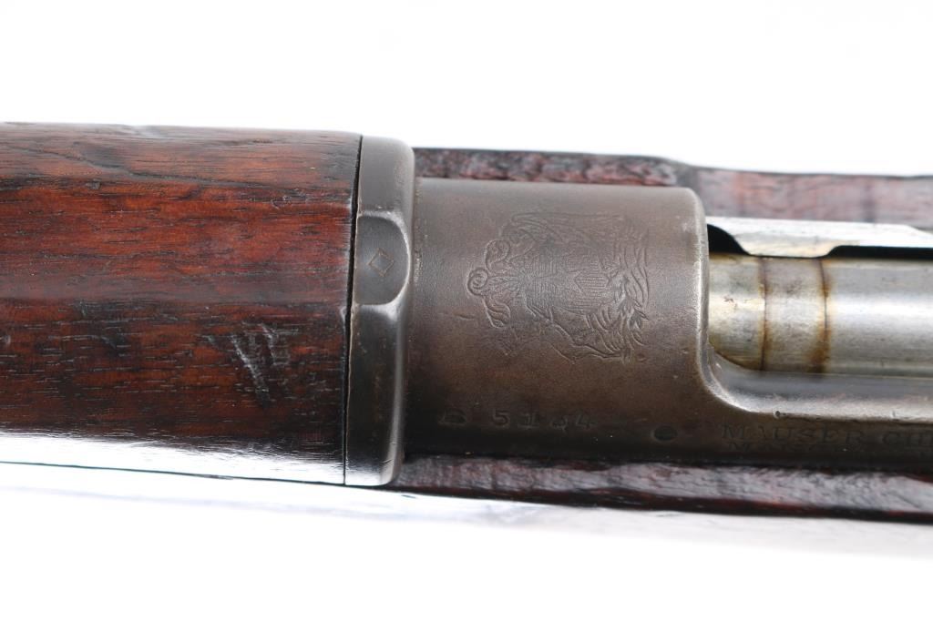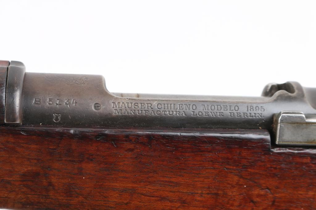 Short Rifle or Mosqueton version of the Mauser 95 made in Berlin for the Chilean government circa 1895 to 1896. Manufactured 1895. Features 22" barrel, blade front sight with protective ears, tangent rear sight, bayonet lug, manual safety, bent bolt handle, side mounted sling swivels. Bore is fair, dark in grooves with strong rifling. Metal surfaces show a mottled brown over gray patina, scratches & dents. Stock is dark colored, oil stained, with even coverage of small dents & scrapes, overall fair to good and serviceable condition. Bolt and cleaning rod mismatched. Chilean crest on receiver ring appears shallow. Chilean cartouche on left butt stock. Condition is NRA Very Good. Antique Firearm.