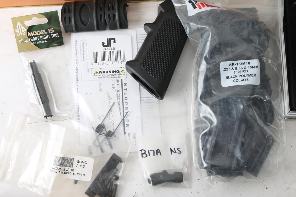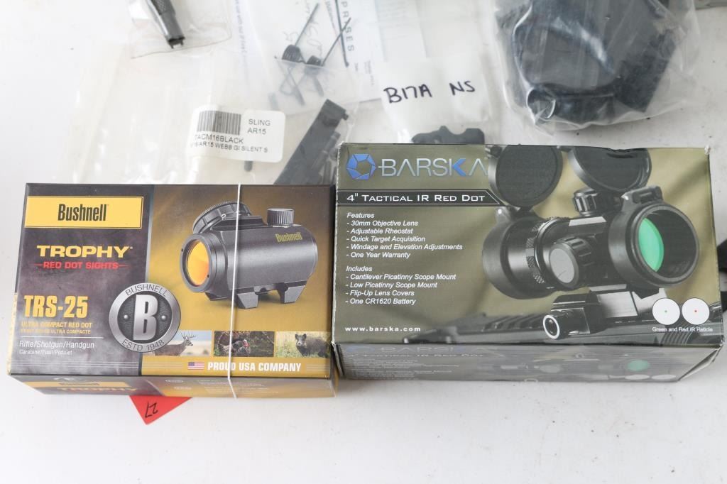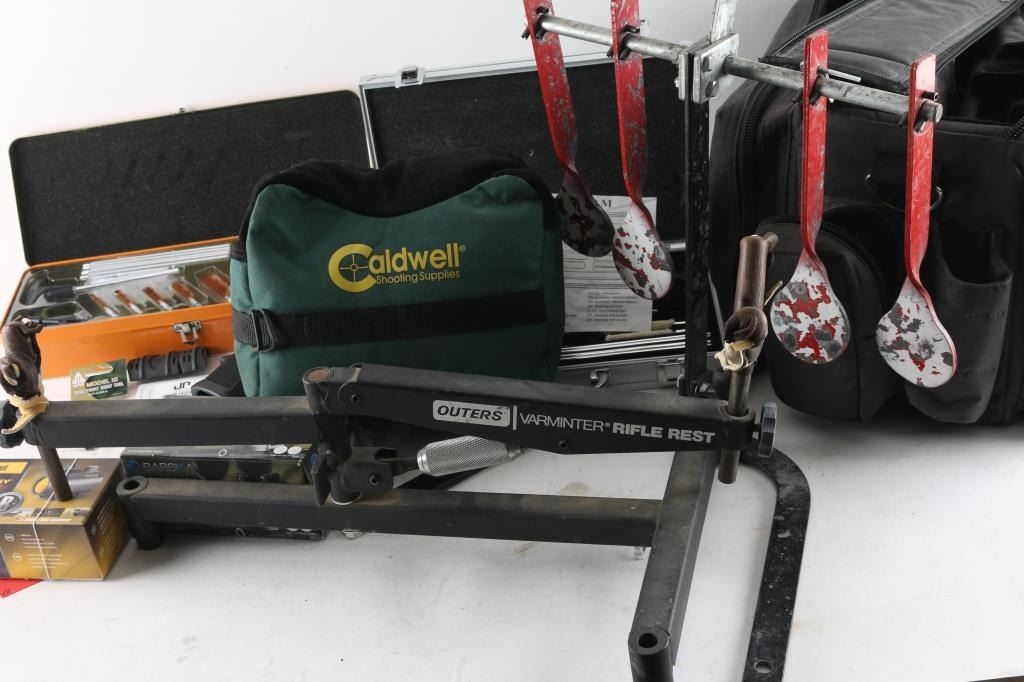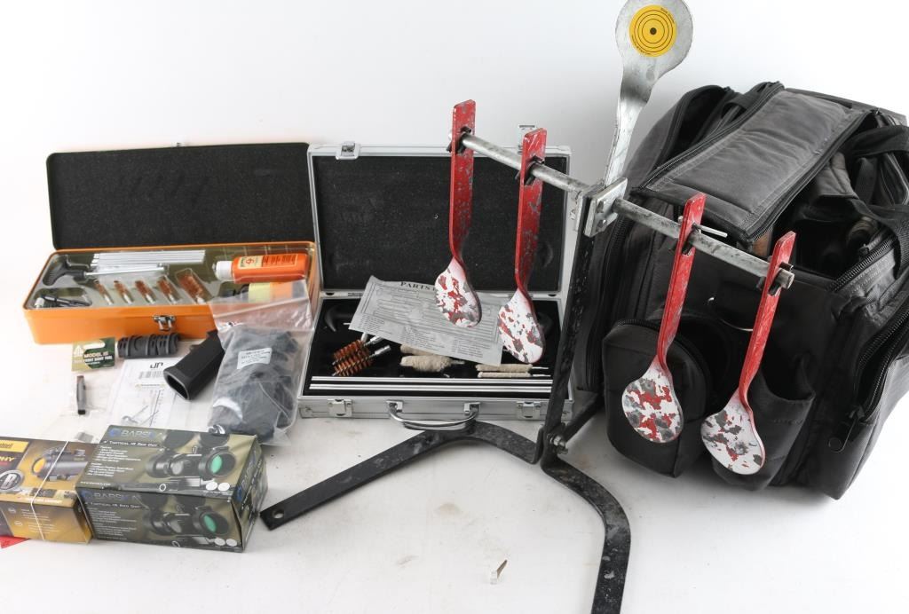 Includes Outers Varminter rifle rest; set of Caldwell shooting bag rests; small caliber metal spinner target set; 2 - red dot sights, Bushnell & Barska; plastic ammo can of AR15 parts; 2 - cleaning kits, Hoppe's & off-brand; Tactical Performance range bag; 4 - nylon pistol holsters & 3 - pistol sleeves; Case-gard pistol magazine plastic ammo can.