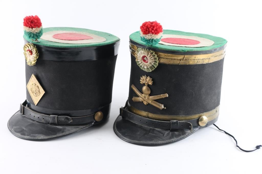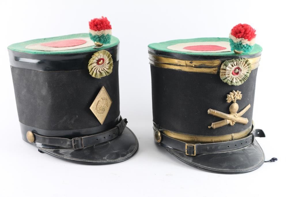 These Shako's were most likely used in the 1960 John Wayne movie the Alamo as these came form the estate of Joe Musso, who worked on the film, and was a personnel friend of John Wayne, but we have no documentation to say for sure. There is one Infantry, and one artillery shako. The shako's have the green, red and white felt on the top with a matching pompom. Right below the pompom is a circular cockade and below that is the Shako Plate. The front of the infantry Shako has a black stripe around the top edge of the Shako and also around the bottom edge. The artillery has gold trim. Leather chinstraps. Both in very good condition.