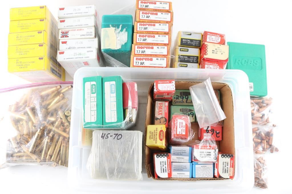 Includes over 2000 bullets from .22 Cal - 45 Cal., primed and unprimed casings from 25-06 - 45-70, 3 die sets from 25-06 to 338 Win Mag.