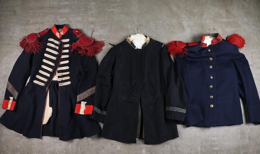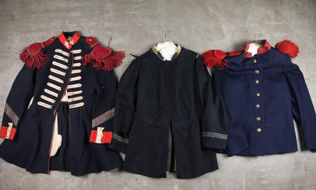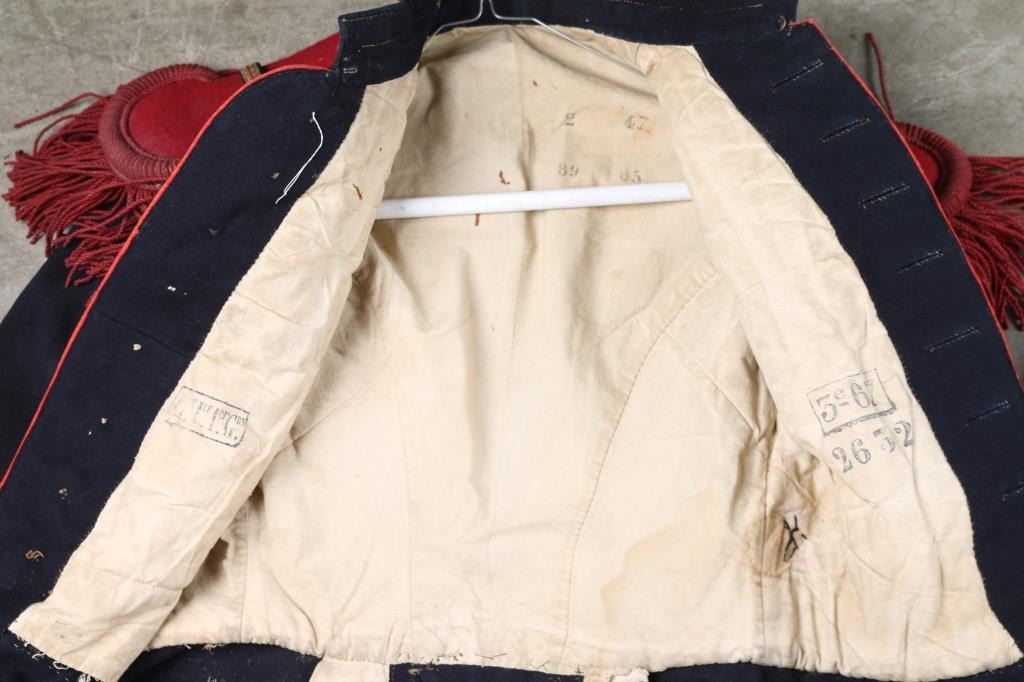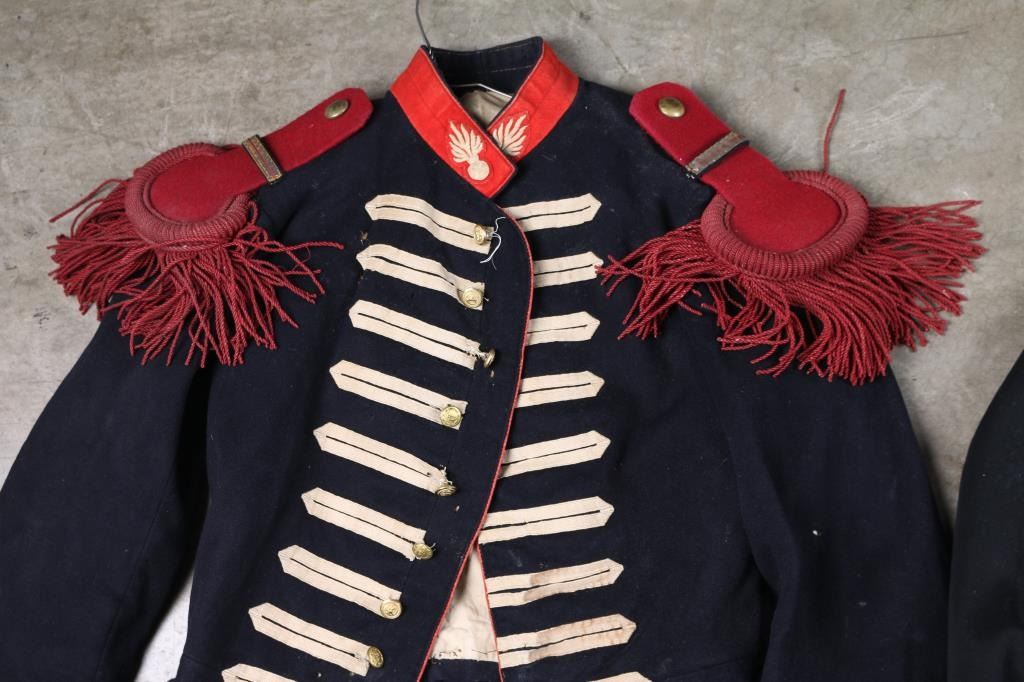 Three Total. 1) Vintage French Foreign Legion tunic. Believe late 19th, early 20th century. Blue wool construction with red collar, red epaulets, seven front buttons, two cuff buttons, six rear buttons, and two epaulet buttons, all marked "Etrangere Legion". One cuff button missing. Overall very good condition. 2) French 118th Infantry Regiment tunic, again believe late 19th, early 20th century. This regiment was one of the most famous and elite of all of the French Line regiments and was thus nicknamed "the Brave." They distinguished themselves in action at both Aspern Essling and Borodino in addition to 36 other engagements. Poor condition, white collar with embroidered "118", and flaming bomb buttons, collar is moth eaten. Three stripes on sleeve, blue wool is stained, and has moth nips. missing buttons, with three newer replaced flaming bomb buttons in in back. Still a very famous regiment. 3) 19th century French Artillery coat, blue wool with red trim, collar, & cuffs. White "flaming bombs" on collar, the buttons have been replaced, a mixture of eagle, and "P". We don't believe the epaulets are original to this coat. Original, but probably used as a movie prop at some point as this comes from the Joe Musso collection. Overall good with some minor moth damage. Ink stamps in liner, including a unit stamp.