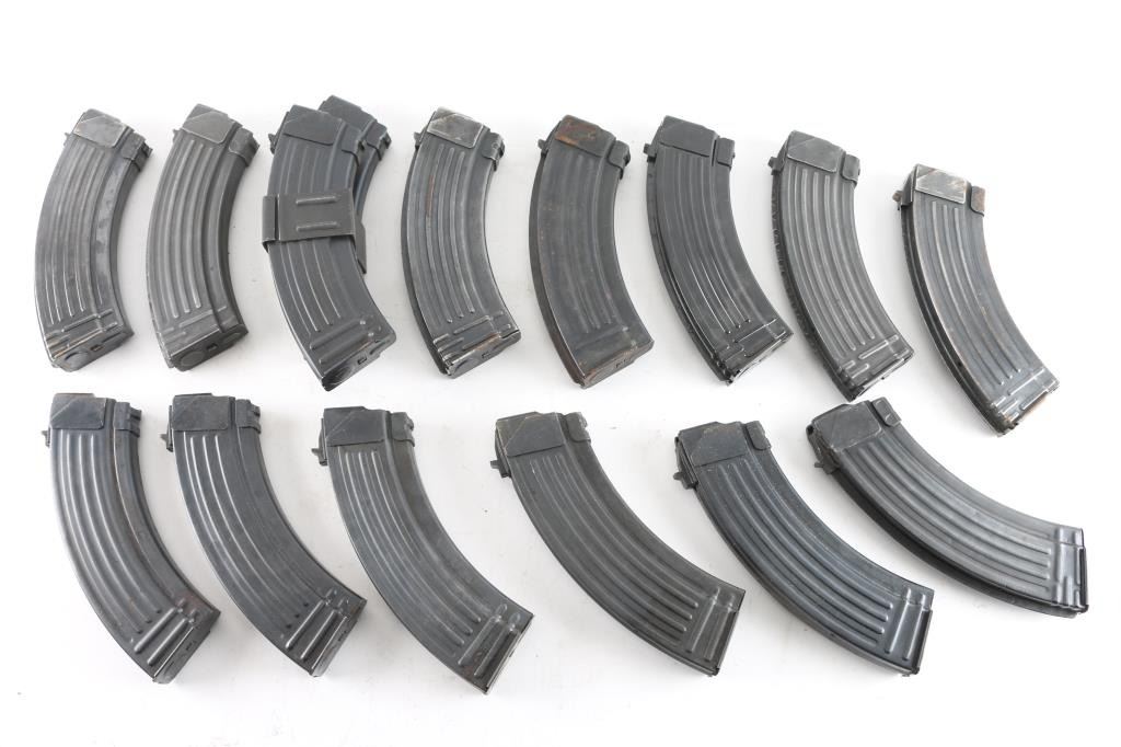 15 total. All steel 7.62 X 39mm 30 round magazines. Some "Fin-back". German, Romanian and other makes.