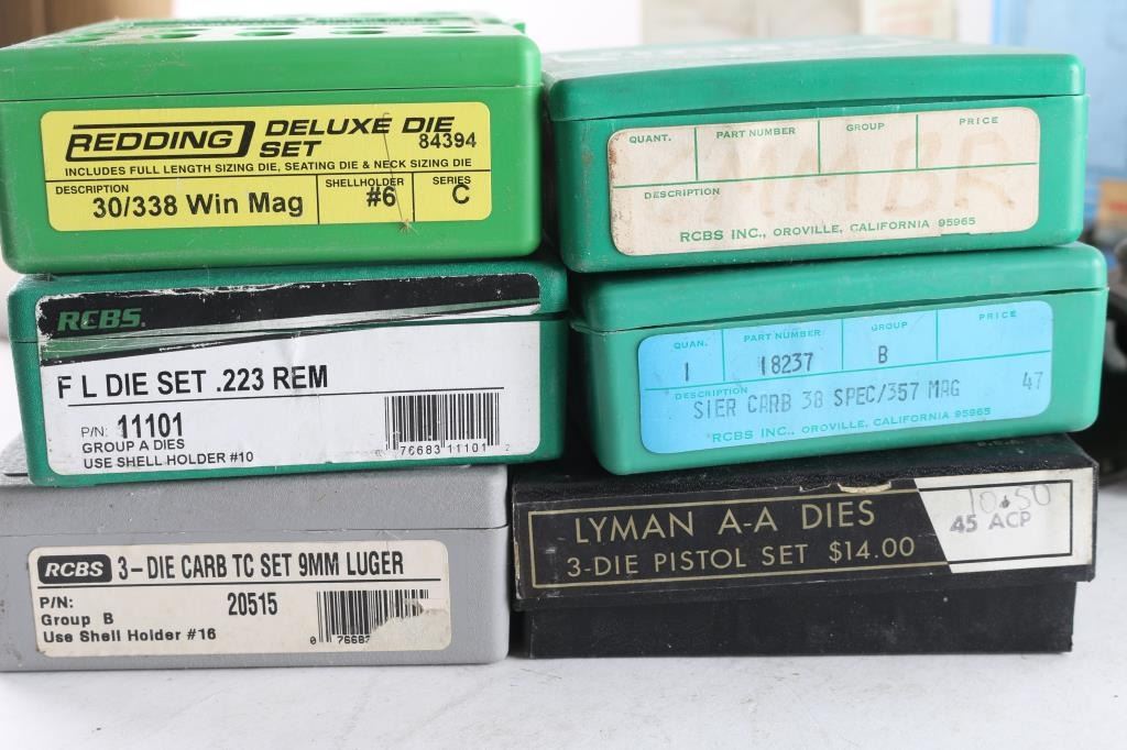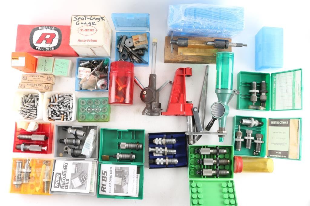 Includes 8 Lbs. of .30 Cal cast bullets & some copper .223, 9 die sets from 30 cal - 45 cal, 2 powder dispensers & Misc. tools.
