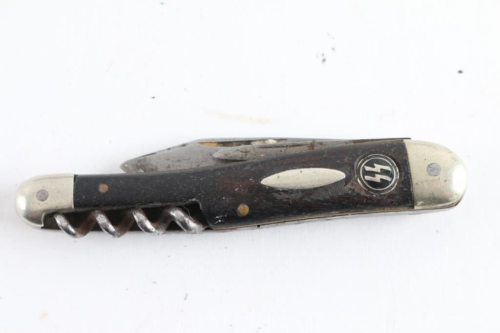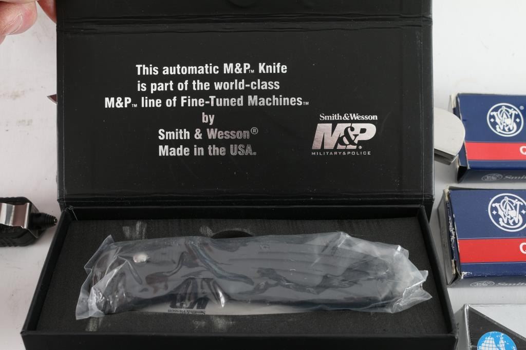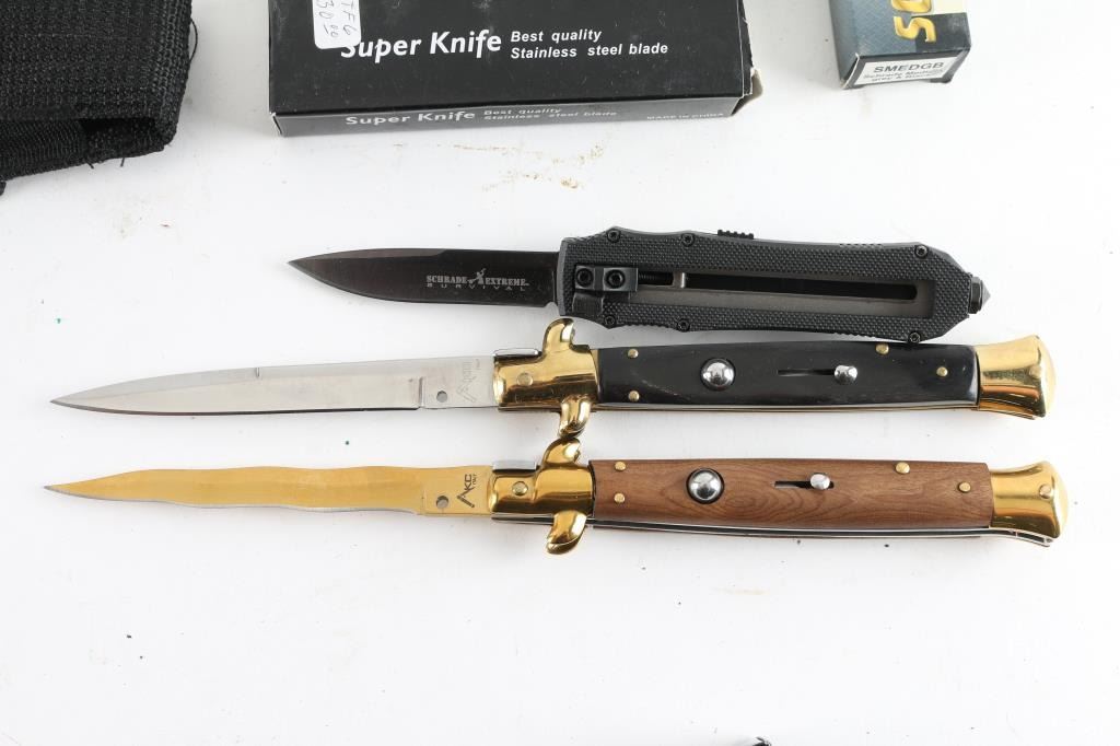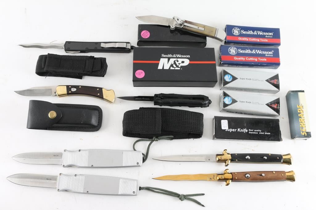 1) AKC Italian switchblade, new in box. 2) Smith & Wesson S.W.A.T. switchblade, new in box. 3) Smith & Wesson H.R.T. switchblade, new in box. 4) AKC Italian switchblade, new in box. 5) Two Xingwen switchblades, both new in box. 6) Super Knife automatic, new in box. 7) Inox G.o.m. lever lock switchblade, new in box. 8) Schrade switchblade, new in box. 9) Unmarked, automatic knife. 10) Smith & Wesson M&P automatic, cased, new. 11) Unmarked automatic with wavy blade, black nylon scabbard 12) Schrade extreme survival automatic, black nylon scabbard. 13) unmarked automatic, black leather scabbard, new in box. 14) Unmarked automatic, black nylon scabbard. 15) Vintage Walther folding knife, two blades, & corkscrew, it has a roundel from a German WW2 SS dagger with SS runes inletted in the wood grip. Looks period done. Interesting.