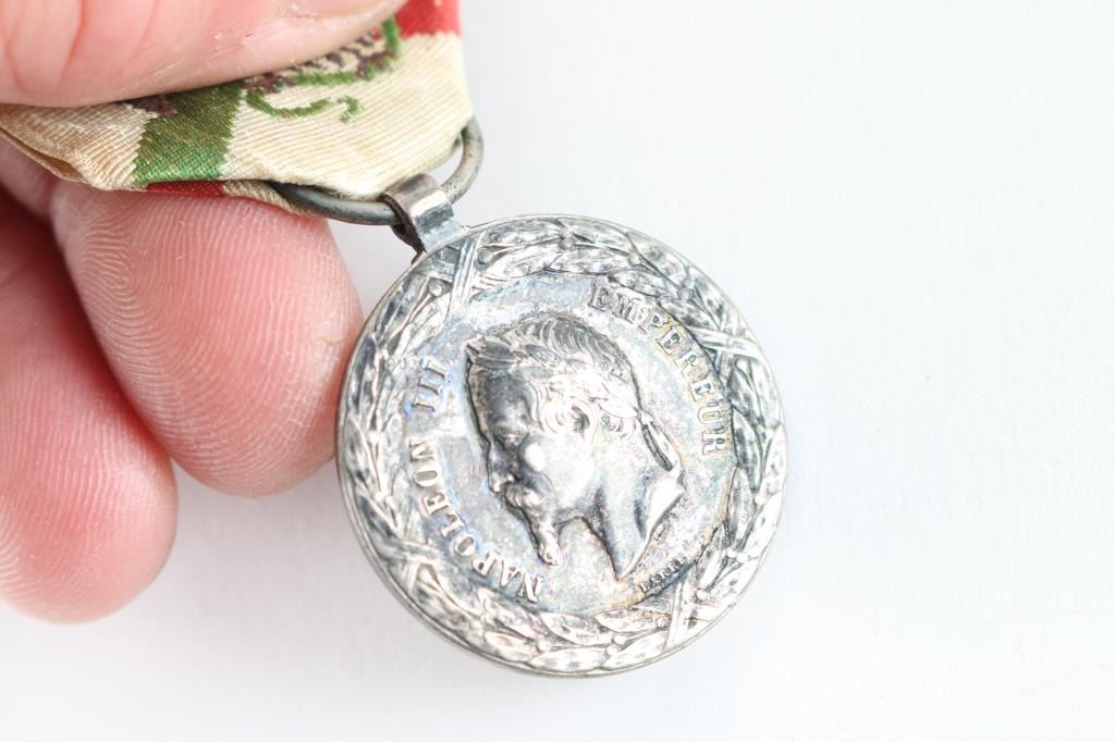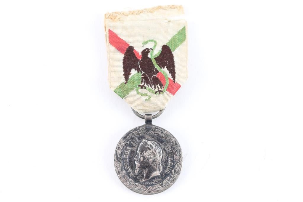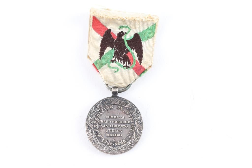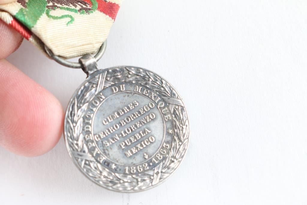 Commemorative medal of the Mexican Expedition in finely chiseled silver, on the obverse the legend NAPOLEON III EMPEROR surrounds the effigy of the crowned Emperor; on the reverse the inscription EXPEDITION FROM MEXICO 1862 - 1863 with the name of the battles of CUMBRES, CERRO-BORREGO, SAN-LORENZO, PUEBLA, MEXICO, with its original highly decorative ribbon, from 1863. Signed by Barre,(Famous Medallist 1818-1878) and has mark of a small anchor. This expedition resulted in the death of almost 7000 French soldiers, mostly from disease. Very Good condition. From the Joe Musso Collection.
