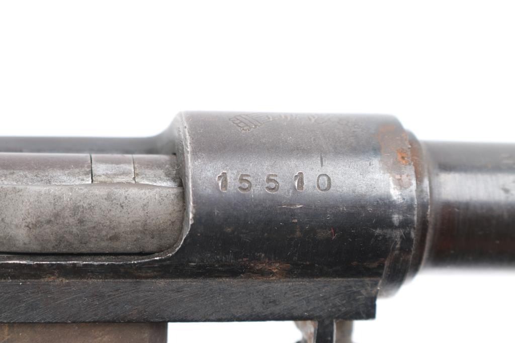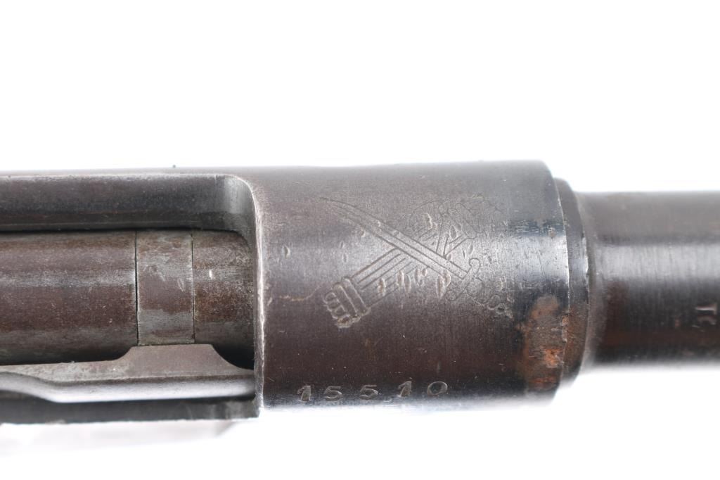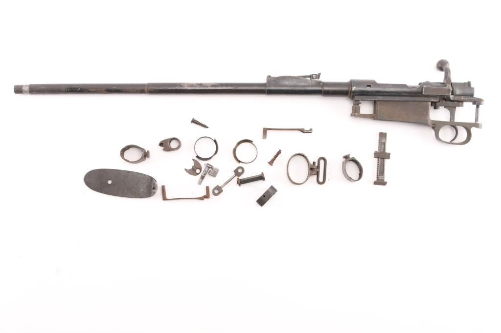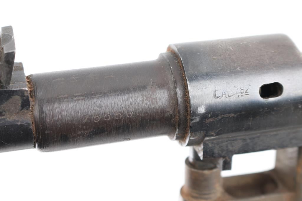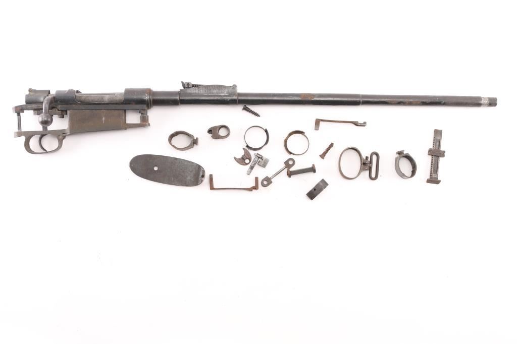 Oviedo Model 1916 short rifle barreled action, .308 Win. SN: Z5356/15510. tangent rear sight, bottom metal. trigger assembly, bore is good/bright. No front sight. Area of rust/pitting on the barrel. Has the crossed sword/axe crest on chamber. Comes with the rest of the parts, butt plate, barrel bands/springs, screws, etc. Imported by Samco.
