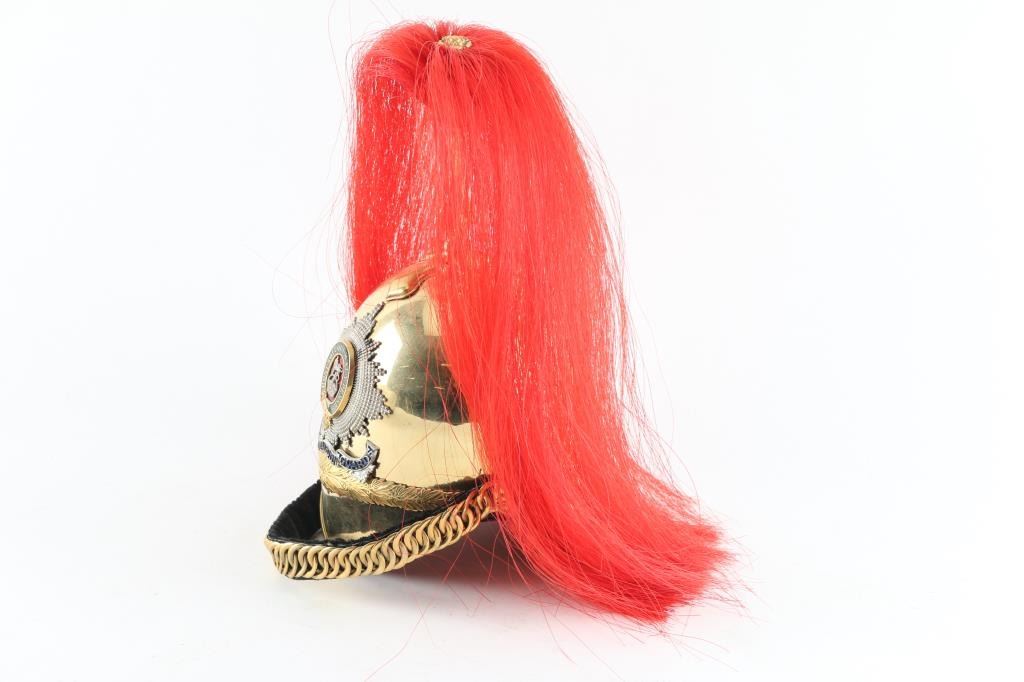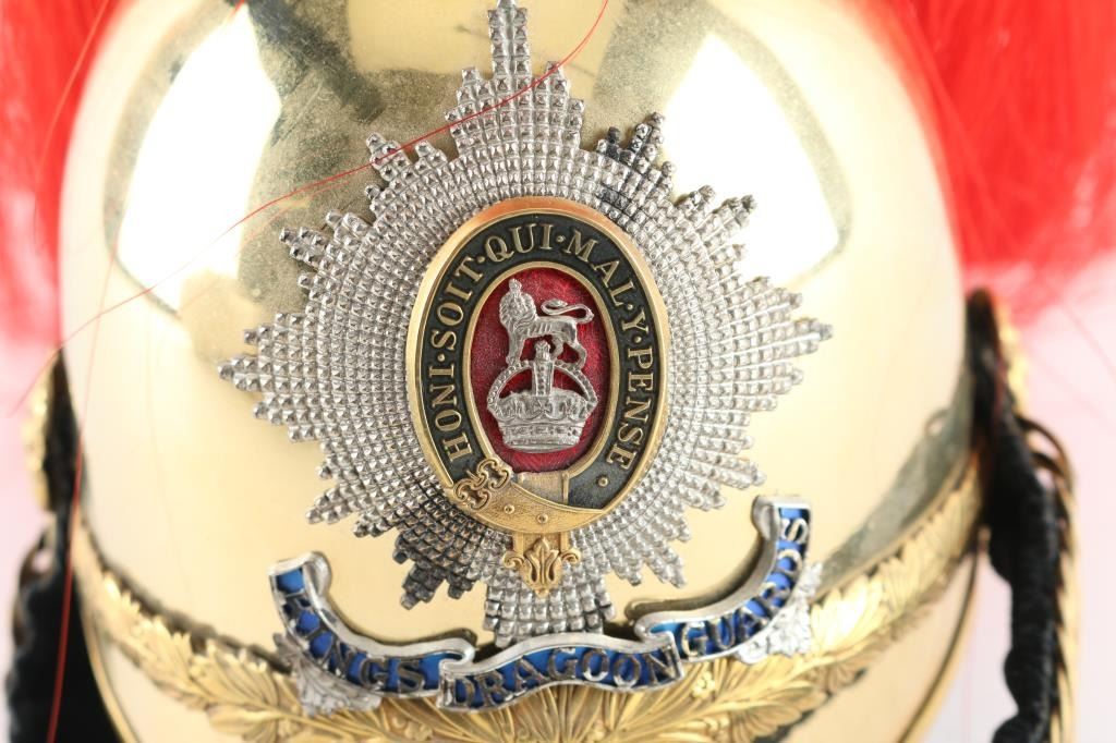 This is a vintage very high quality small display helmet measuring 10" in height of an Officer's Victorian era Dragoon Guards 1871 pattern helmet. The front and rear peaks are edged with gilt metal and are lined with green leather. There is a gilt laurel leaf band across the top of the front peak and another running from the top of the skull to the bottom of the rear peak. The helmet plate is a diamond cut 12 pointed silvered star. On top of the star is a gilt metal elliptical shaped garter with the motto "HONI SOIT QUI MAL Y PENSE" and a "VR" cipher inside the garter with a red translucent enamel background. Beneath the star is a heavy silver banner with the title "KINGS DRAGOON GUARDS". backed with blue enamel. A red horsehair plume hangs from the gilt fluted plume holder with a four pronged base. There is a small gilt Tudor rose at the top of the plume. Tudor rose ear bosses suspend a scaled gilded chin chain backed by black velvet. Tan leather sweatband with red silk lining. Construction and specs are just like an original helmet, Very high quality workmanship. Perhaps in memory of service. Comes with wooden stand. From the Joe Musso collection.