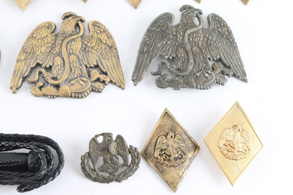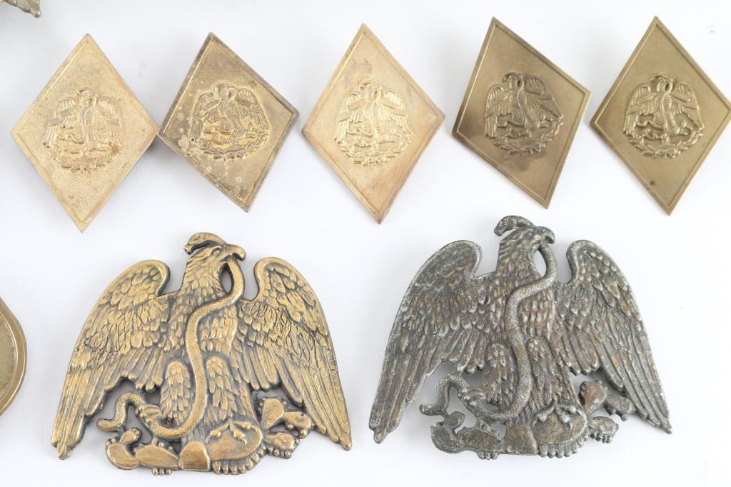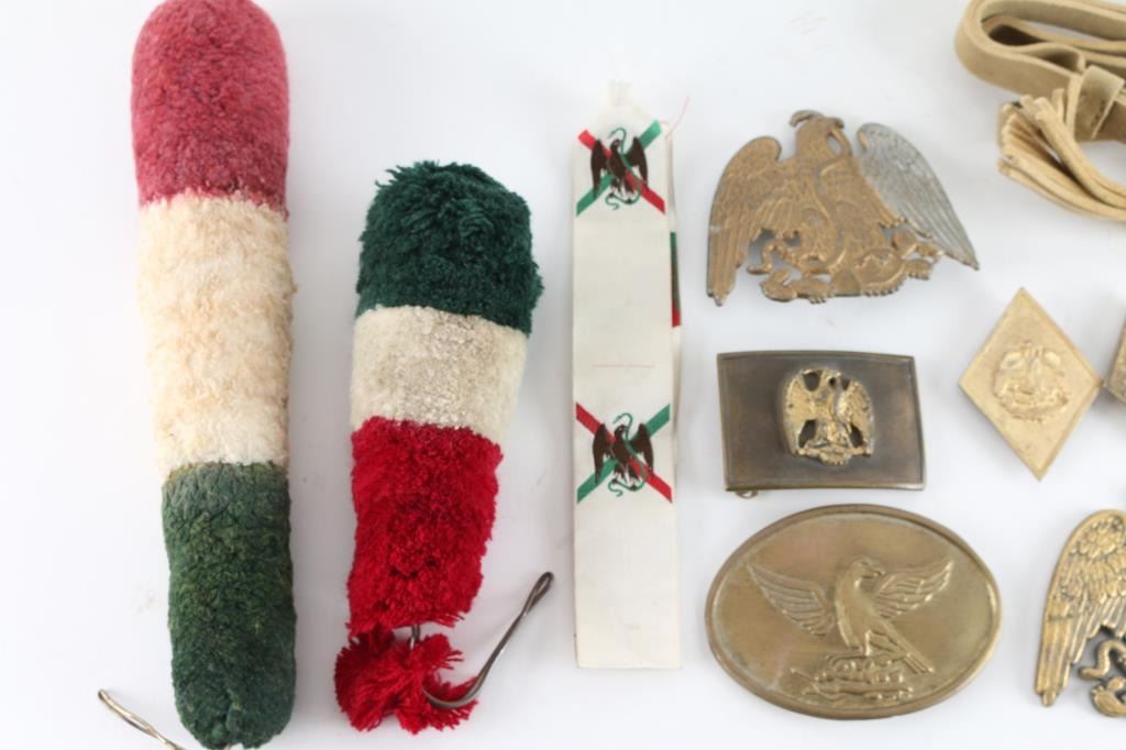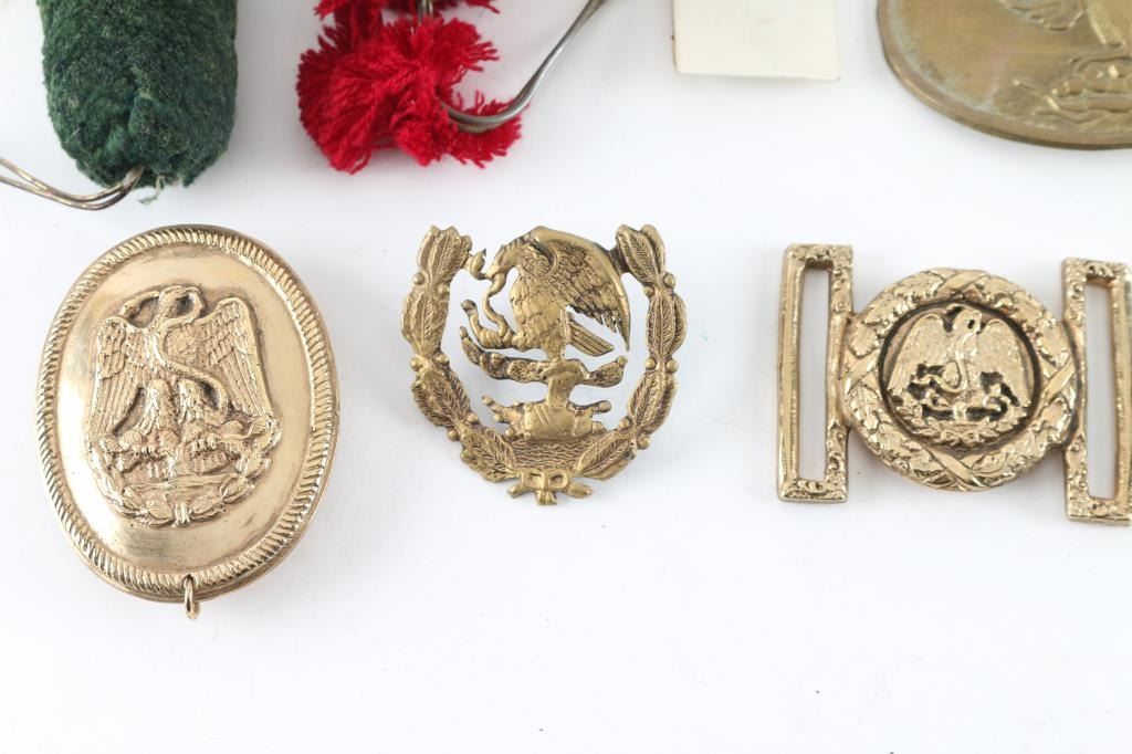 These were most likely used in the 1960 John Wayne movie the Alamo as these came form the estate of Joe Musso, who worked on the film, and was a personnel friend of John Wayne, but we have no documentation to say for sure. Lot consists of six small stamped diamond shaped eagle/Snake shako plates, three leather swords, Three large Eagle/Snake shako plates, two brass Eagle/Snake belt buckles, two brass oval with Mexican shako plates, Mexican Eagle, and Eagle/Snake, two smaller Eagle/Snake, wreath cap badges, and two shako pompoms with Mexican tri colors.